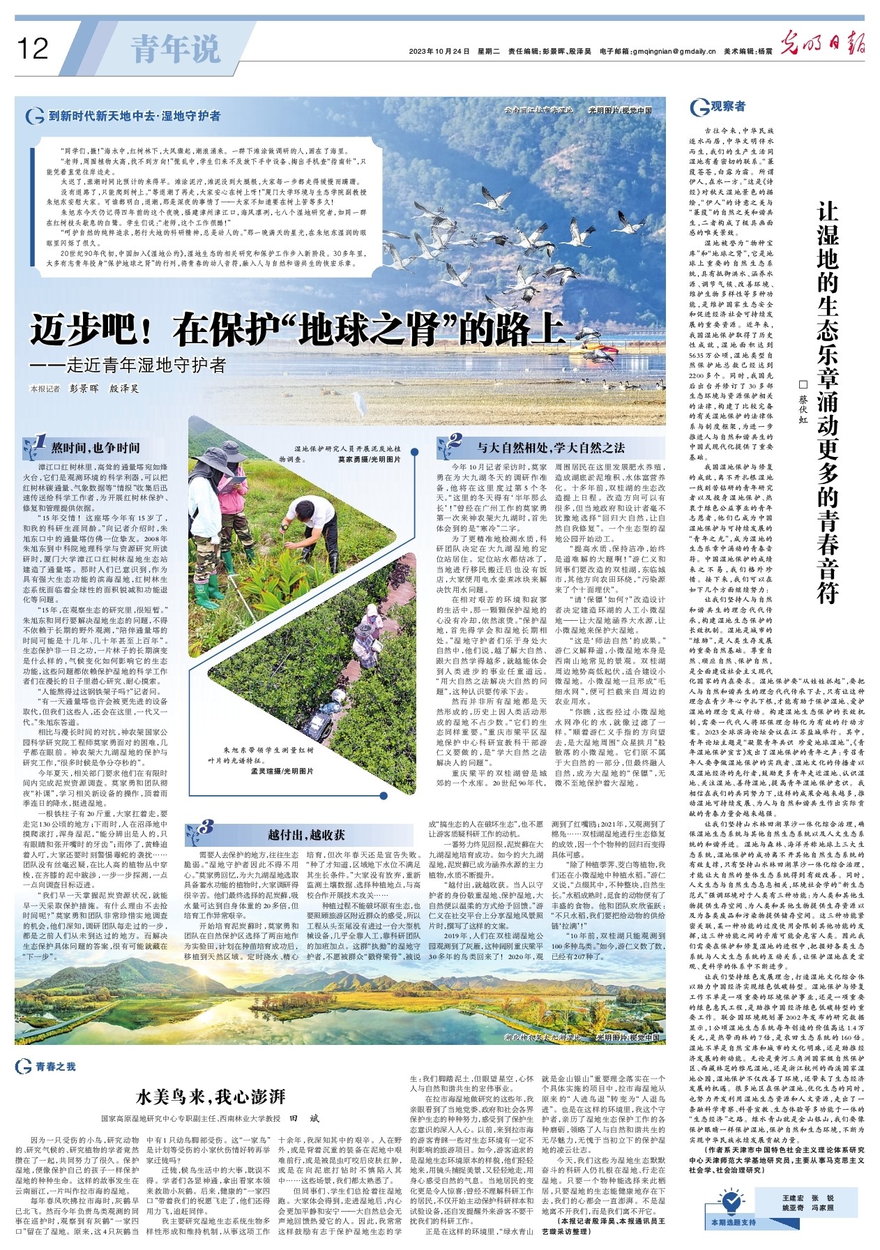 20世纪90年代初,中国加入《湿地公约》,湿地生态的相关研究和保护工作步入新阶段。30多年里,太多有志青年投身“保护地球之肾”的行列,将青春的动人音符,融入人与自然和谐共生的恢宏乐章。