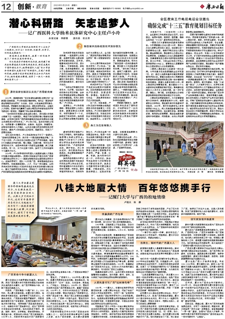3月25日,广西日报刊发了厦门大学与广西近百年来的校地情缘专题报道,其中以一定篇幅报道了我院毕业生为广西发展做出贡献的事迹。