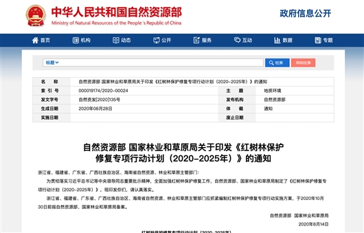 日前,自然资源部、国家林业和草原局联合印发《红树林保护修复专项行动计划(2020-2025年)》(下称《行动计划》)。在8月28日召开的新闻发布会上,自然资源部生态修复司司长周远波表示,到2025年,营造和修复红树林面积18800公顷。