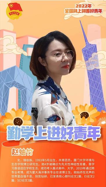 赵蚰竹,厦门大学环境与生态学院2019级博士研究生。四岁被确诊为先天性神经性耳聋,靠学习唇语适应学校生活,成功考入重点高中、大学,2019年跨专业考博,成为厦门大学环境与生态学院在读博士生。进入厦门大学后,在学院的关心和老师同学的帮助下,赵蚰竹学习劲头更足了,每天都沉浸在科研学习中,始终在无声的世界里自强不息、刻苦钻研,取得高质量科研成果,2022年6月光荣地加入了中国共产党,奏响了人生新乐章。