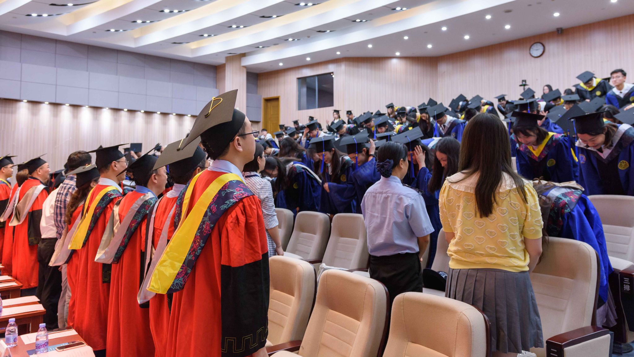 在感恩致谢环节中,毕业生通过鞠躬的方式,表达了对老师、行政后勤员工和父母亲友的崇高敬意与衷心感谢。