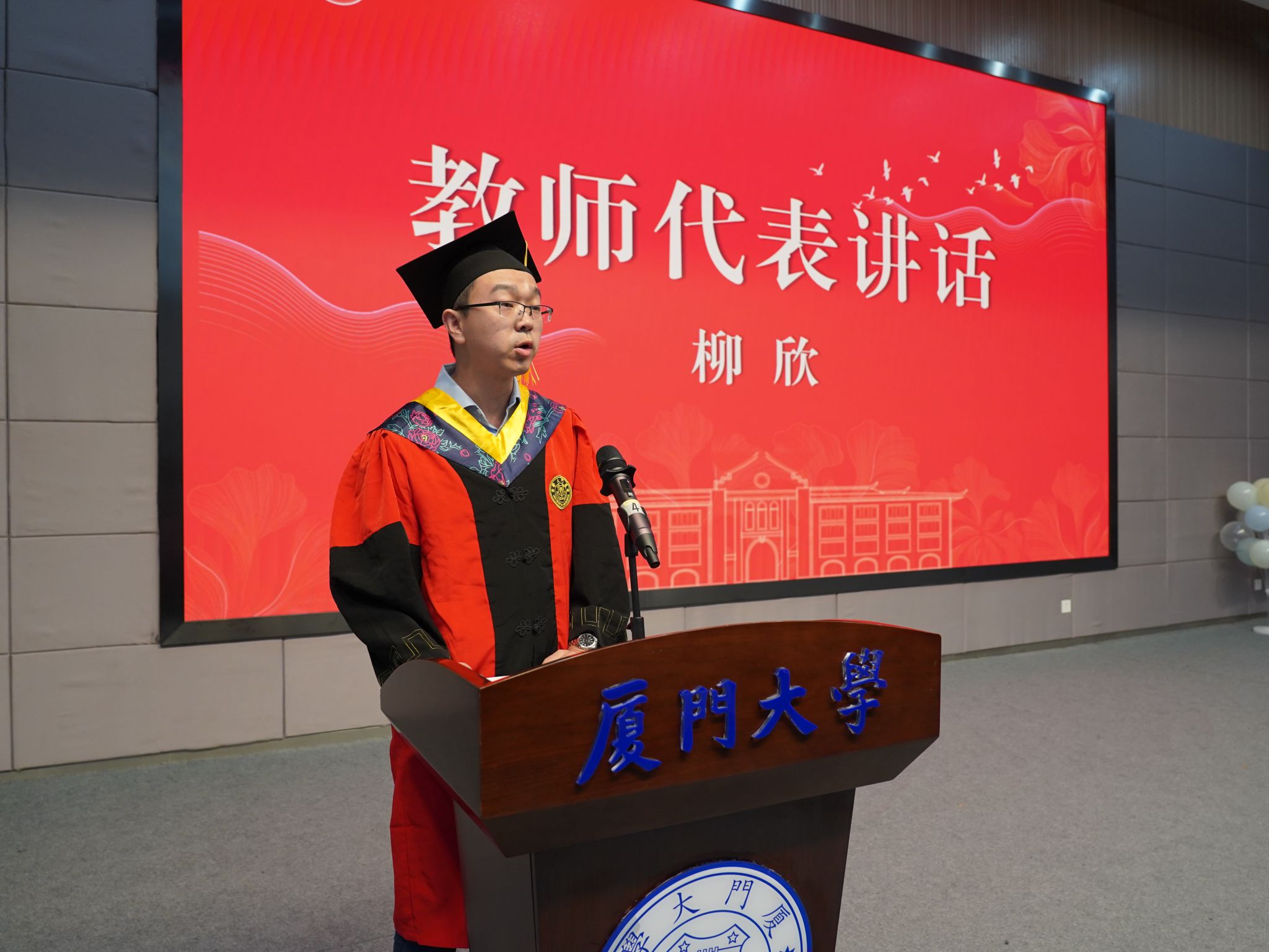 教师代表柳欣希望同学们在未来的征途上能够扬帆远行,追求自己的星辰大海,并寄语毕业生看清全局、顺应大势、勇立潮头;保护自己、做好自己、热爱生活;善待他人,特别是爱你的人。