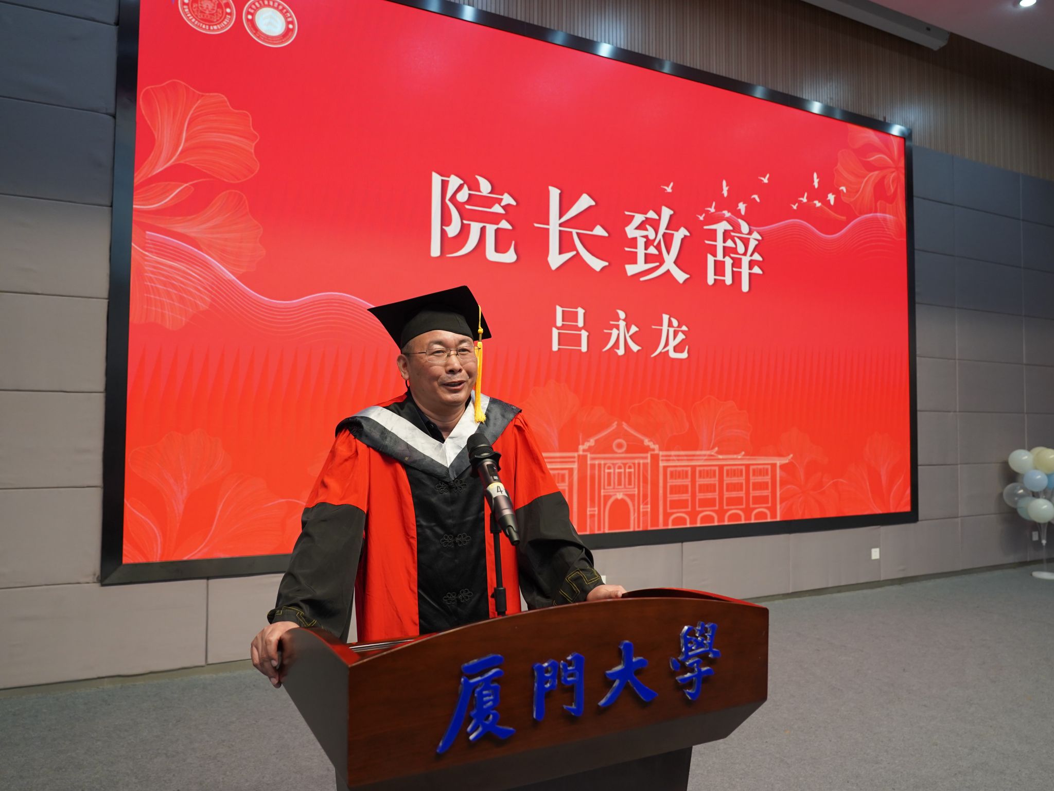 院长吕永龙致辞。他代表学院祝贺2022届毕业生圆满完成学业,顺利取得学位,叮嘱全体毕业生:一是要铭记厦大建校以来的爱国优良传统,无论走到哪里,都要秉承校主陈嘉庚先生的爱国精神;二是要铭记厦大“自强不息,止于至善”的校训,无论处于何种境遇,都要坚持自强自立,追求尽善尽美;三是铭记厦大环生院是毕业生永远的家园和栖息的港湾,环生院愿在毕业生们取得成就时共享喜悦,也愿在毕业生们遇到困难时共叙衷肠。他希望所有毕业生能够从“零”做起,在社会这所新的“大学”里交出满意答卷,拿到最优成绩,做个诚实的、有价值的、大写的“人”,学会尊重他人,通力合作,推动个人事业进步发展。最后,他祝愿毕业生们前程似锦,一帆风顺。
