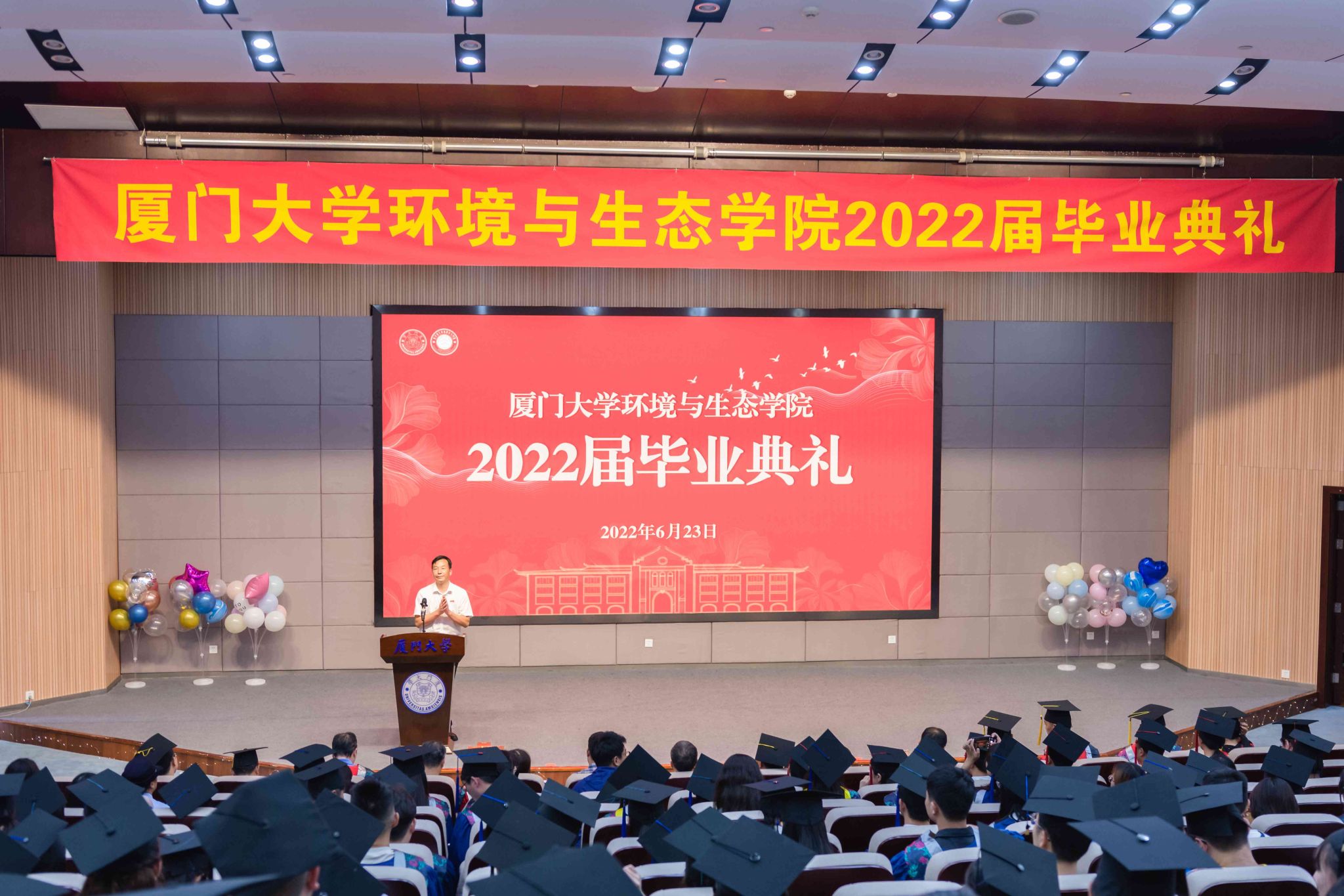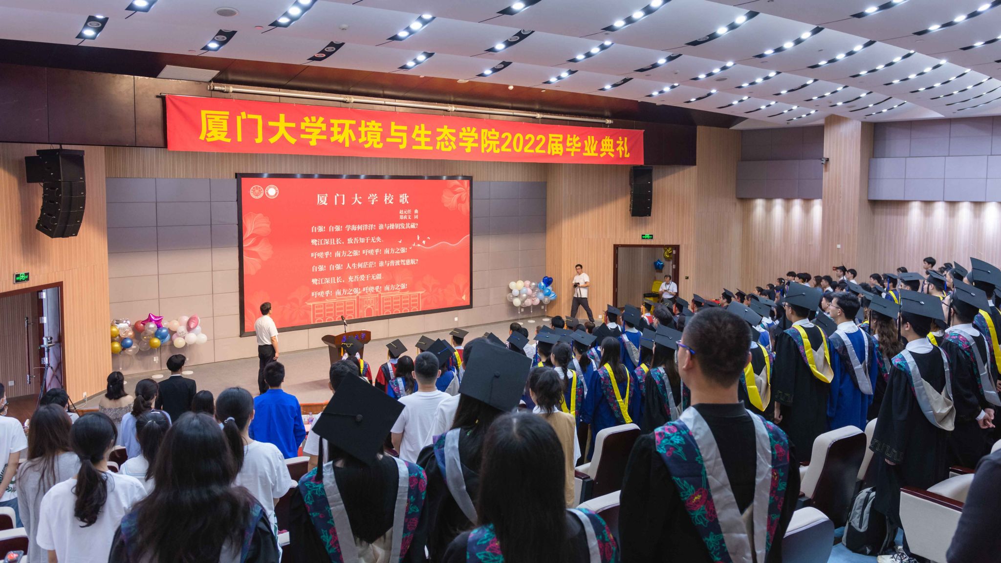最后,全体师生高声齐唱《厦门大学校歌》,“吁嗟乎!南方之强!吁嗟乎!南方之强!”,在歌声中,环境与生态学院2022届毕业典礼落下帷幕。