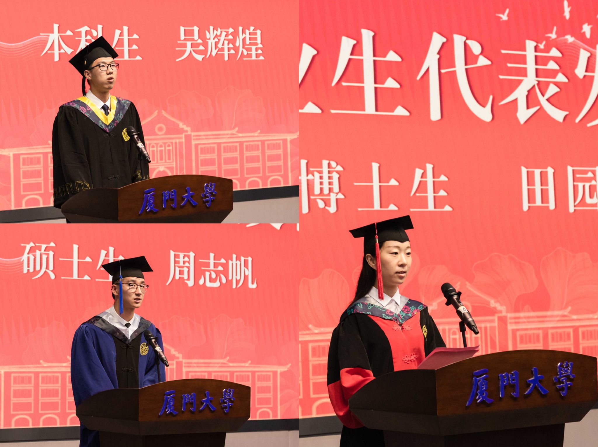 2022届本科毕业生代表吴辉煌、硕士毕业生代表周志帆、博士毕业生代表田园依次上台发言。他们回忆了过去多年在厦园的学习与生活,感谢学院和老师的悉心培养和关怀呵护,并呼吁全体毕业生生逢其时,肩负重任,当立鸿鹄之志,做青春的奋斗者、搏击者、奉献者。
