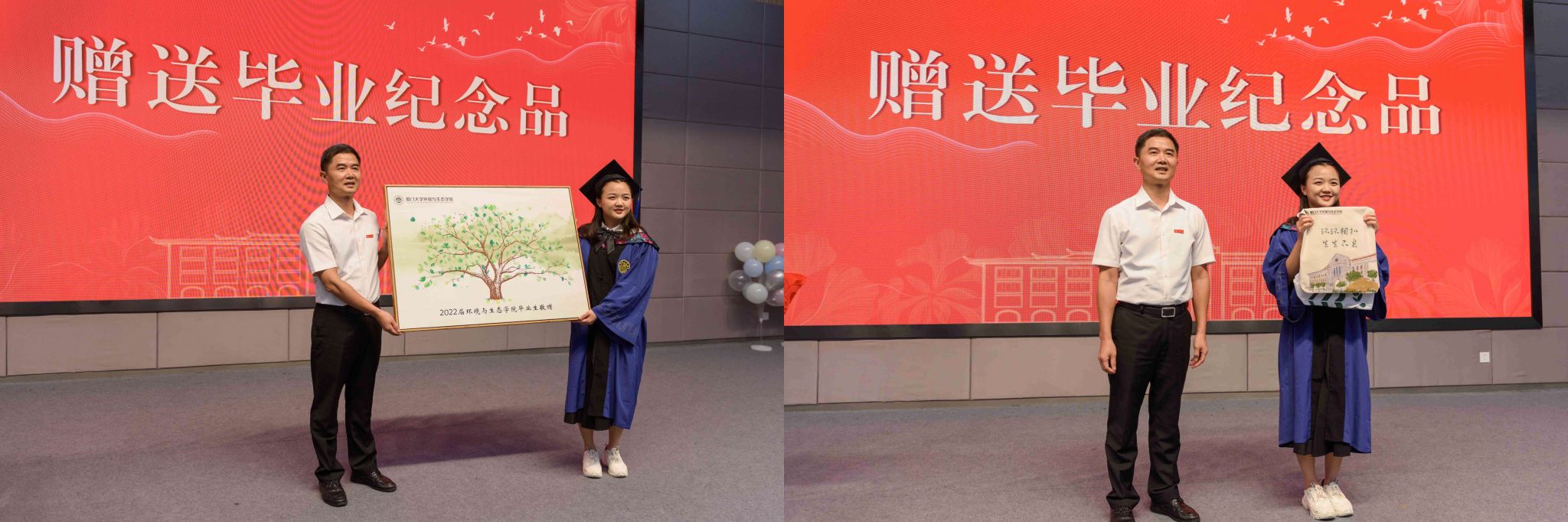 谢宇婷同学代表毕业生向学院赠送毕业纪念品——一幅由全体2022届毕业生用指纹绘制而成的“指纹树”绘画,党委书记张明智代表学院接受赠礼,并回赠了具有学院特色的毕业纪念品。