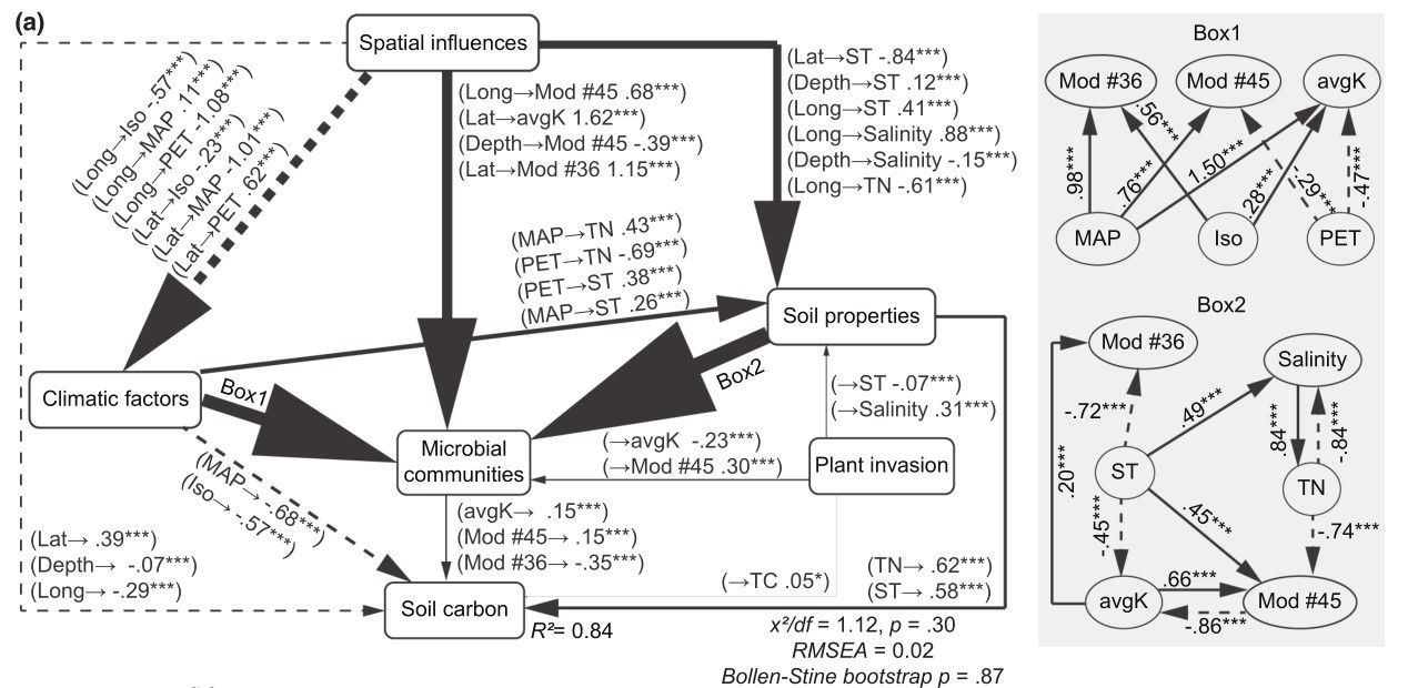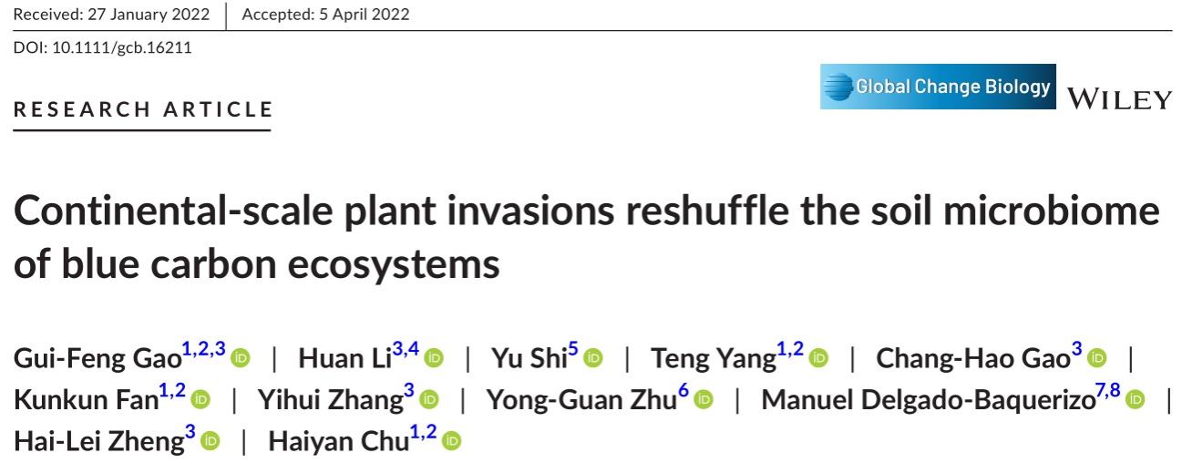 论文来源:Gui-Feng Gao#, Huan Li#, Yu Shi, Teng Yang, Chang-Hao Gao, Kunkun Fan, Yihui Zhang, Yongguan Zhu, Manuel Delgado-Baquerizo*, Hai-Lei Zheng*, Haiyan Chu*, Continental-scale plant invasions reshuffle the soil microbiome of blue carbon ecosystems, Global Change Biology, 2022, 28:4423–4438. DOI: 10.1111/gcb.16211