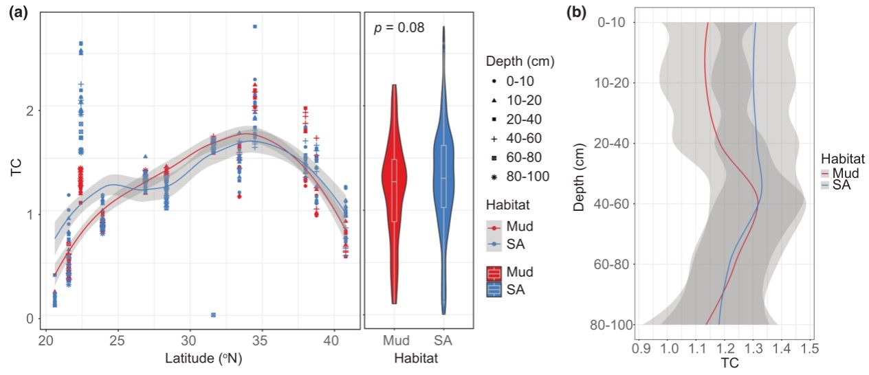 (1)光滩(Mud)与互花米草(SA)土壤在北纬34°左右区域具有最高的土壤碳库,两者总碳含量相当,均表现出明显的纬度分布模式。与光滩土壤相比,互花米草生境土壤的碳积累主要在浅层土壤(0-60厘米)(图1)。