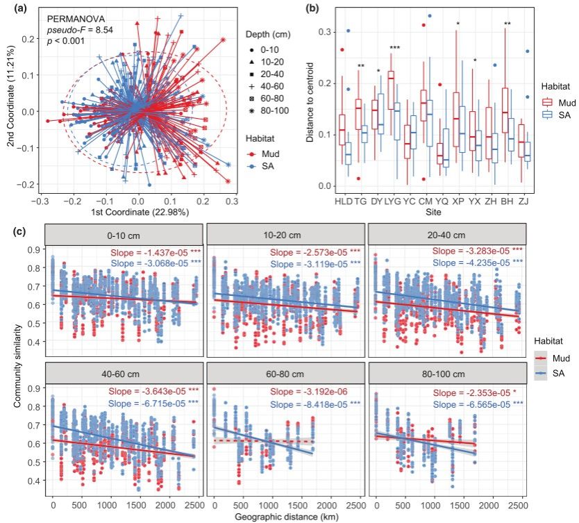 滨海湿地是地球上重要的蓝碳生态系统,在维持生物多样性和调节全球气候变化等方面发挥着关键作用。然而,过去四十年来,我国滨海湿地遭受了大面积的互花米草(Spartina alterniflora)入侵。作为入侵种,互花米草具有极强的环境适应性和繁殖能力,自1979年引入中国后已沿我国海岸线迅速扩张,侵占了大面积本土生境(包括芦苇、红树林和光滩等生境),严重威胁当地生物多样性与生态系统功能,引起学者的广泛关注。滨海湿地生境特殊,孕育了丰富且独特的微生物资源,然而,大陆尺度互花米草入侵下滨海湿地土壤微生物群落多样性的空间分布及其驱动机制仍是未知,这限制了我们对全球变化背景下滨海湿地土壤微生物组演变的准确认识以及对于滨海湿地微生物资源的挖掘。