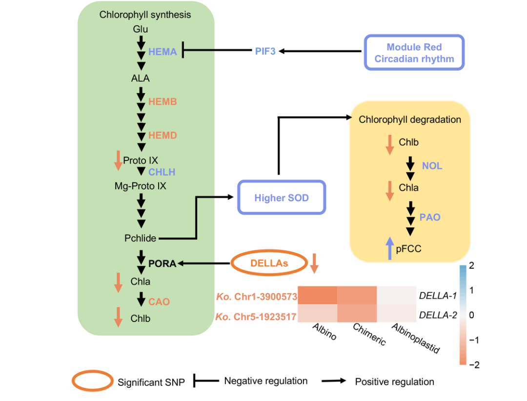 通过将转录组数据和GWAS数据相结合比较,结果显示,显著差异表达基因主要参与卟啉和叶绿素代谢、类胡萝卜素和类黄酮生物合成等通路。特别是编码转录因子的基因KoDELLAs和编码查尔酮合成酶的基因KoCHS可能在促进叶绿素降解的同时,通过减弱叶绿素和类黄酮生物合成途径,进而在调控白化繁殖体质体发育中发挥重要作用。超氧化物歧化酶表达及活性增加又加剧了叶绿素降解。这些都最后导致白化繁殖体的产生。