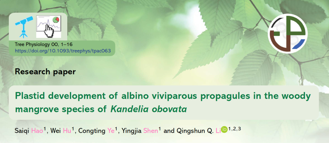 论文来源:Hao S, Hu W, Ye C, Shen Y, Li QQ. Plastid development of albino viviparous propagules in woody mangrove Kandelia obovata. Tree Physiol. 2022 Jun 16: tpac063. doi: 10.1093/treephys/tpac063. Epub ahead of print. PMID: 35708522.