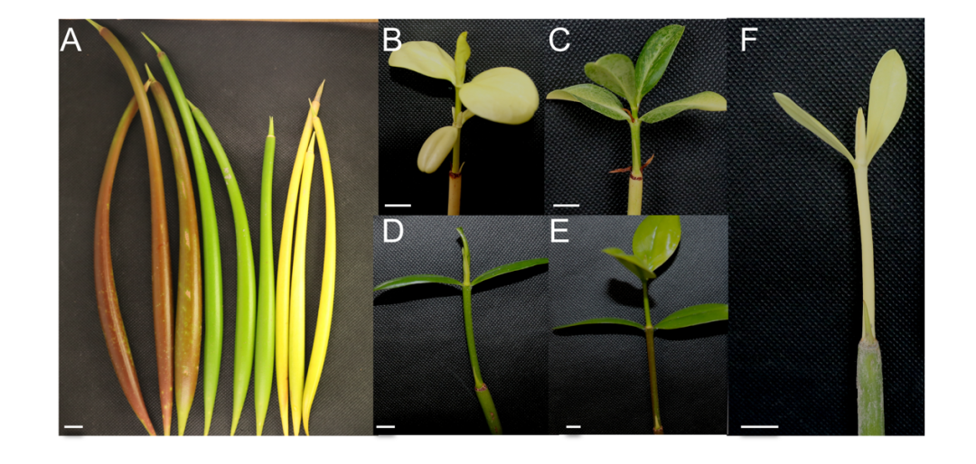 红树林生态系统对滨海湿地的蓝碳和生态保护有重要意义。但是对于红树植物在分子和遗传层面的研究还远远落后。秋茄(Kandelia obovata)是一种常见的胎生红树植物,具有独特的发育方式,即种子不经过休眠,直接在母树上萌发而形成成熟的繁殖体。已经发现,繁殖体存活率与其颜色(棕色、绿色和白化)与存在相关性。在造林实践中,棕色或绿色繁殖体因被观察到成苗快而成为首选,但是其后的成因还未被探明。同时,木本植物,尤其是非模式植物红树,控制不同繁殖体颜色质体发育的分子机制尚不清楚。