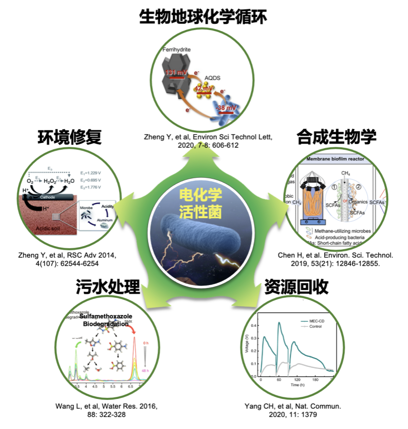 生命代谢的本质是基于电子转移的生化反应过程。1911年微生物Saccharomyces和Bacillus被发现能够产生电流,随后的100多年中,研究人员在跨越古菌、细菌、真菌的9个门类微生物中均证实了微生物产电现象,并将这类通过胞外电子传递实现能量代谢的微生物统称为“电化学活性菌”(Electrochemically Active Microbes)。电化学活性菌是地球生物化学循环(包含碳循环、氮循环、硫循环、铁循环等)中的关键驱动力,也在环境修复、污水处理、资源回收、合成生物学等领域呈现出重要的应用前景(图1)。