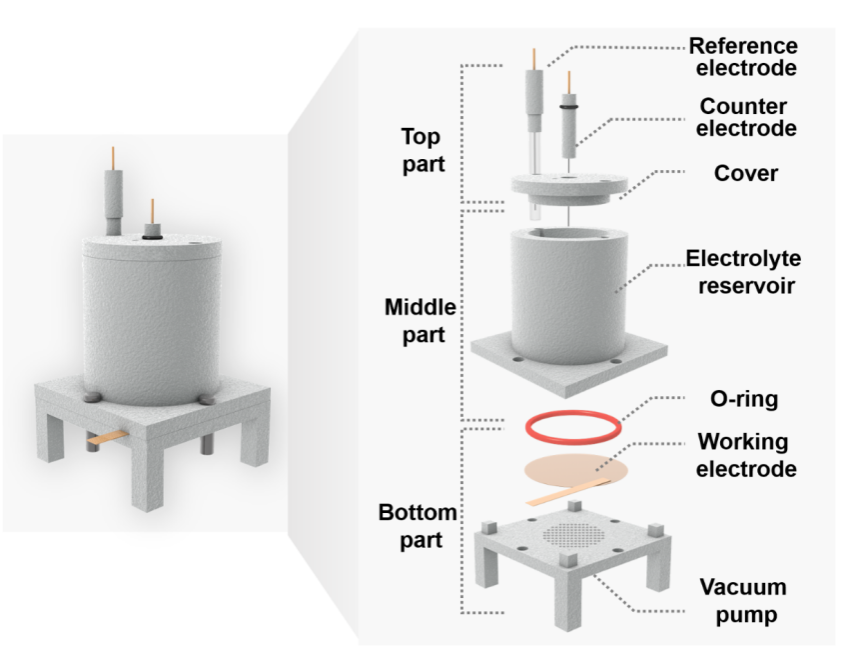 针对电化学活性定量的“快速-准确-容易”要求,“An electrochemical system for the rapid and accurate quantitation of microbial exoelectrogenic ability”的研究,将“过滤”的理念引入到微生物活性测定中(图2)。以负载金纳米颗粒的滤膜作为工作电极,通过真空抽滤实现细胞快速定植于工作电极表面(≤3分钟),传统方法中细胞自发生长附着工作电极的时间>1周。