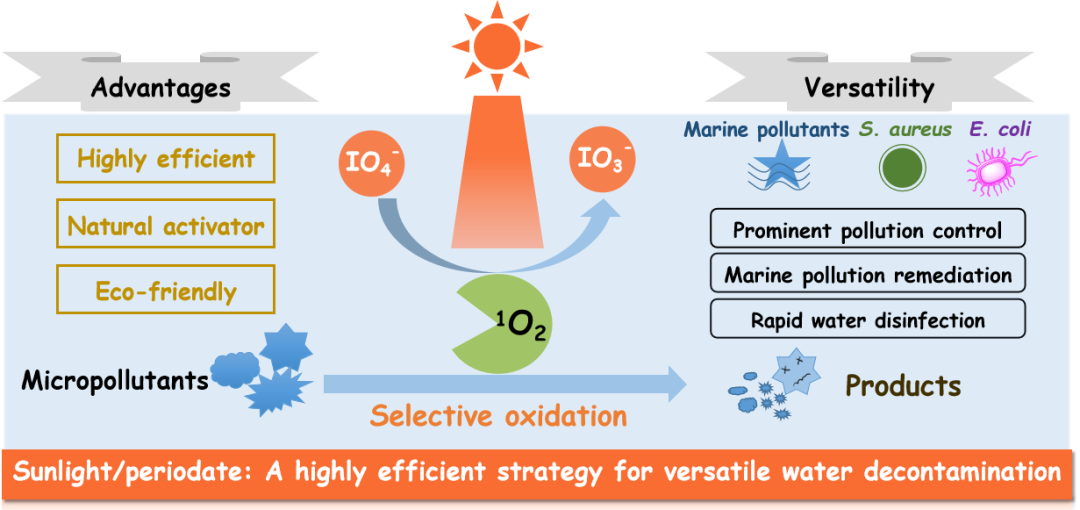 已有研究报道指出,太阳光可作为过硫酸盐、次氯酸等氧化剂的天然活化剂。那么,太阳光能否高效活化PI这一新型氧化剂,进而实现对新污染物的高效、选择性氧化呢?其影响因素、反应机理及产物毒性如何?太阳光/PI系统是否可用于消毒工艺及海洋污染修复?这些均成为开发面向新污染物治理的新型环境友好水处理技术亟需回答的问题。