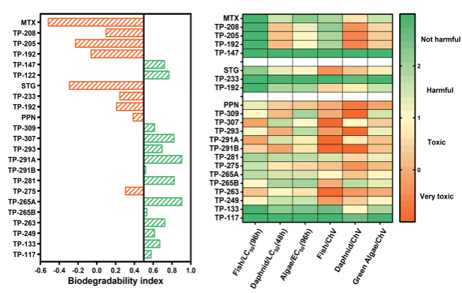 三种典型药物及其降解产物的生物降解性(a)和急/慢性毒性(b)