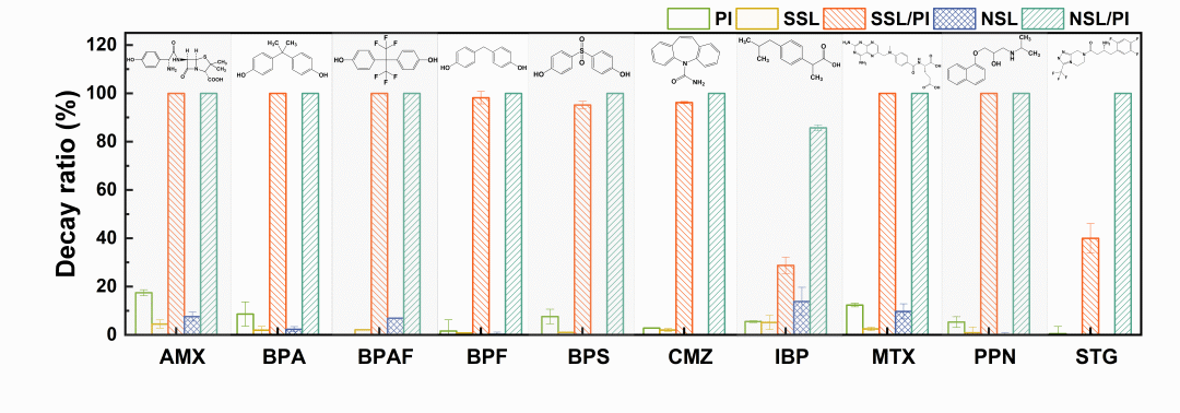 模拟/实际太阳光分别强化PI对各类新污染物的降解效能