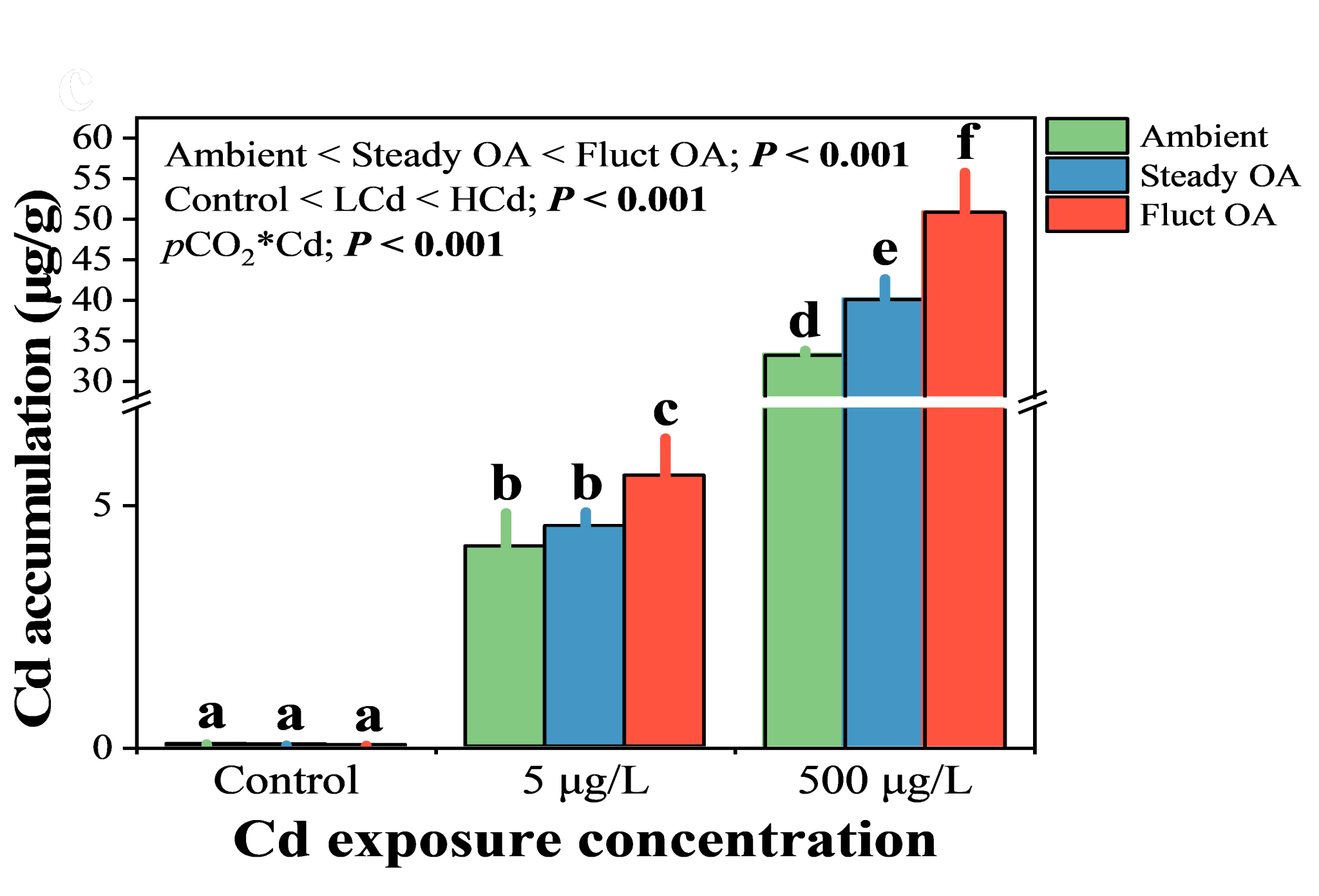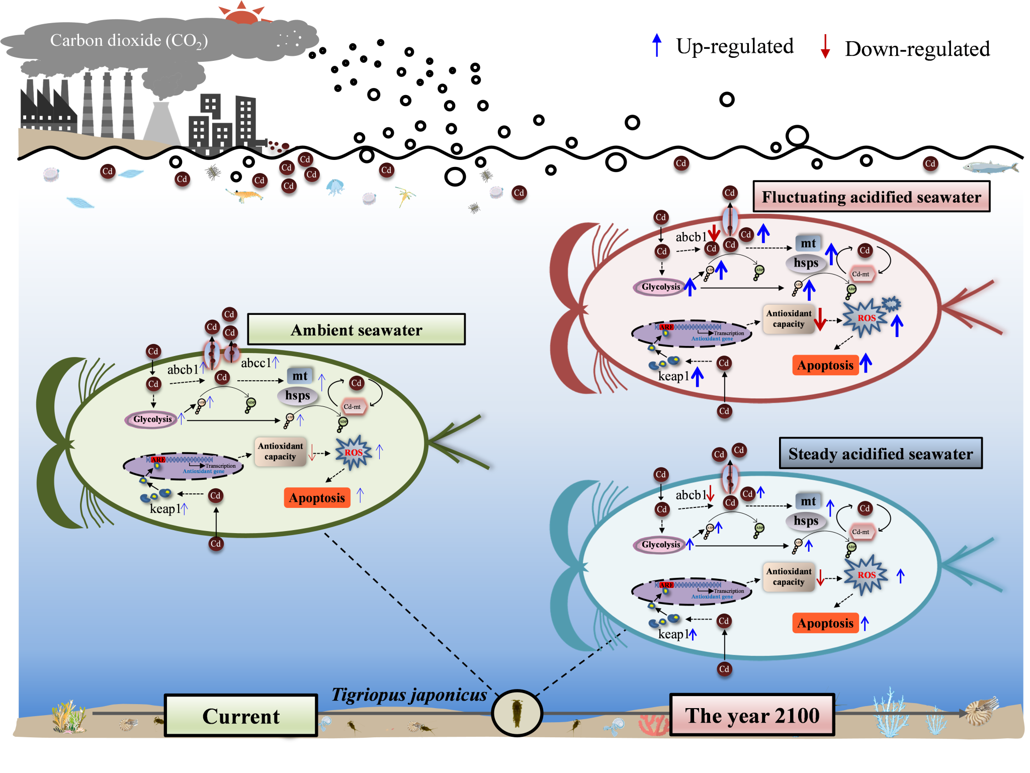 本文以生态毒理学研究的模式物种—日本虎斑猛水蚤(Tigriopus japonicus)为研究对象,首先利用稳定同位素示踪技术确定在环境对照pCO2(400 μatm),稳定高pCO2(1000 μatm,稳定酸化)和波动高pCO2(1000±600 μatm,波动酸化)与镉联合胁迫下镉的累积速率常数(kaccu);之后我们将日本虎斑猛水蚤暴露于上述3种pCO2情境与环境相关镉污染(5 μg/L和500 μg/L)下7天,分析桡足类体内镉累积和生理生化指标。结果表明:1)波动酸化的kaccu显著高于环境对照pCO2和稳定酸化的kaccu(图1);2)暴露后,相同水平镉污染下,比起环境对照pCO2,酸化显著增加桡足类体内镉的累积,且波动酸化组最高(图2);3)相较于单独镉污染,酸化与镉联合胁迫显著抑制了桡足类体内镉的外排,造成镉累积的增加。此外,联合胁迫产生了更多的能量、更强的解毒防御和应激反应、并增加了氧化应激和凋亡(图3)。