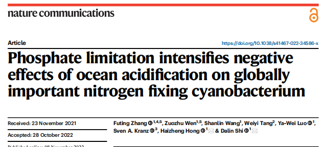 近日,我院史大林教授课题组与国内外合作者,在海洋酸化对优势固氮蓝藻束毛藻影响的研究上取得重要进展,相关成果以“Phosphate limitation intensifies negative effects of ocean acidification on globally important nitrogen fixing cyanobacterium”为题发表于Nature Communications。该研究揭示了磷限制加剧海洋酸化对束毛藻固氮作用的抑制效应及其机理,为理解和预测全球变化对海洋氮循环的影响及其生物地球化学效应提供了重要科学依据。