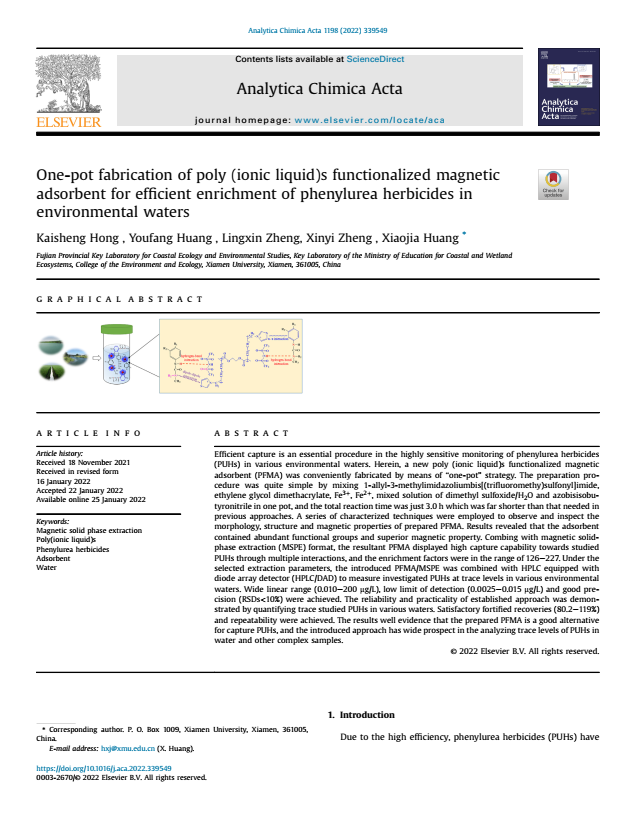 我院承办的厦门大学节能减排社会实践与科技竞赛继2020年获得年会品牌校级学业竞赛项目后又摘获2022年度品牌校级学业竞赛项目。郁昂老师指导了多项科创竞赛项目,覆盖来自我院、管理学院等的40余名本科生,参与各项各级别科创竞赛并取得多项优异成绩,本年度获评厦门大学本科生科创竞赛优秀指导教师。2019级本科生洪恺声(指导教师:黄晓佳)以第一作者发表的SCI论文获得本科生优秀论文一等奖,同时,作为全校入选第十五届全国大学生创新创业年会的两篇论文之一,还获得本年度本科生优秀学业竞赛奖一等奖。2020级本科生张浩坤、徐亦琪、章钰(指导教师:黄晓佳) 及2019级本科生江林珂、王思溱(指导教师:冯明宝)发表的SCI论文获得本科生优秀论文二等奖。洪恺声、郑灵欣、郑欣宜完成的大创项目《功能化氧化石墨烯磁性纳米材料的“一锅法”制备及其在环境中有机污染物监测中的应用》获评优秀、最佳大学生创新创业训练计划项目(指导教师:黄晓佳)。张浩坤、徐亦琪、章钰完成的大创项目《磁固相萃取-色谱联用技术及其在复杂样品中汞形态分析的应用研究》获评优秀大学生创新创业训练计划项目(指导教师:黄晓佳)。