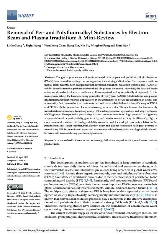 2019级本科生江林珂、王思溱发表的论文中PFOA在电子束和等离子体辐照下的转化途径和反应机理示意图