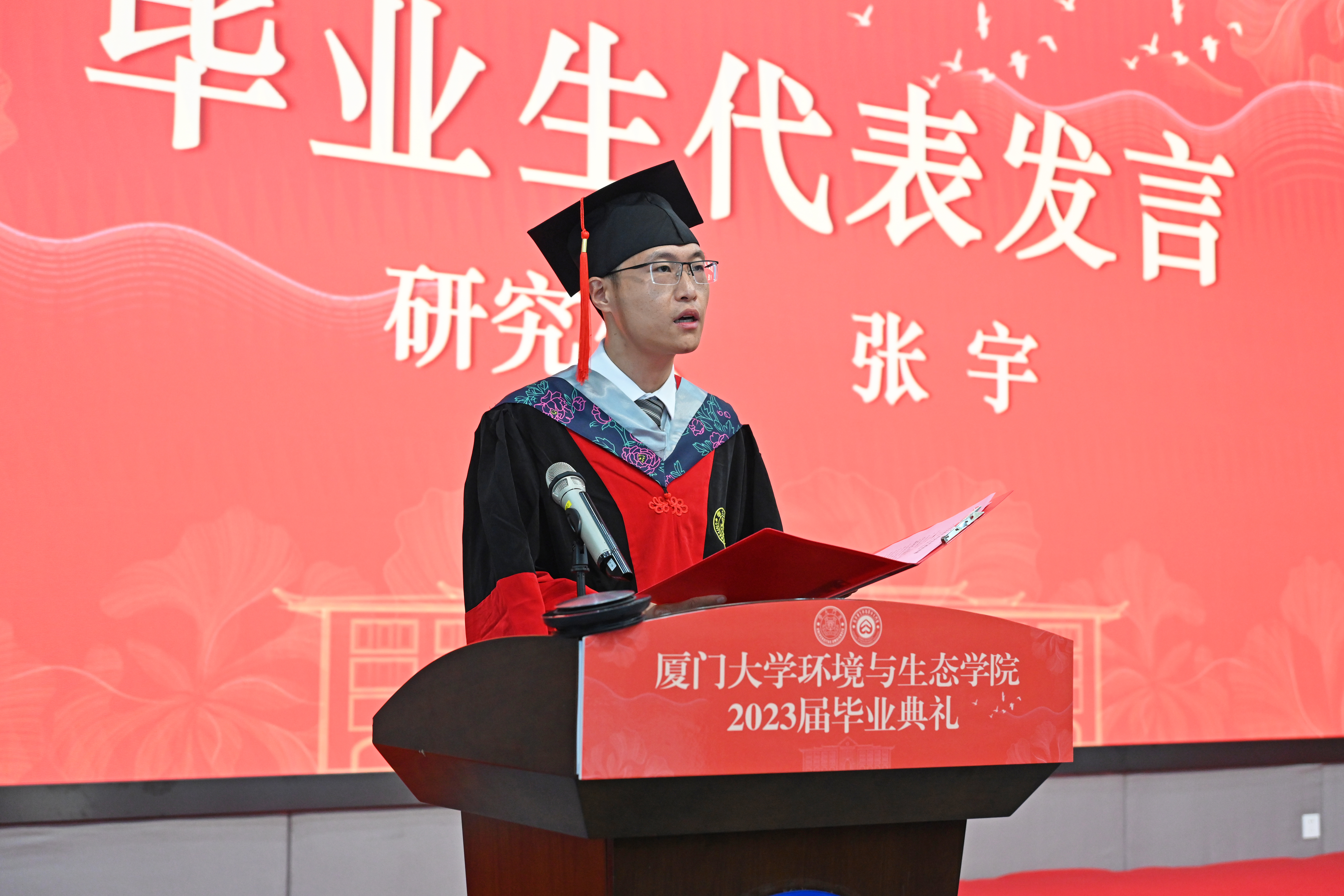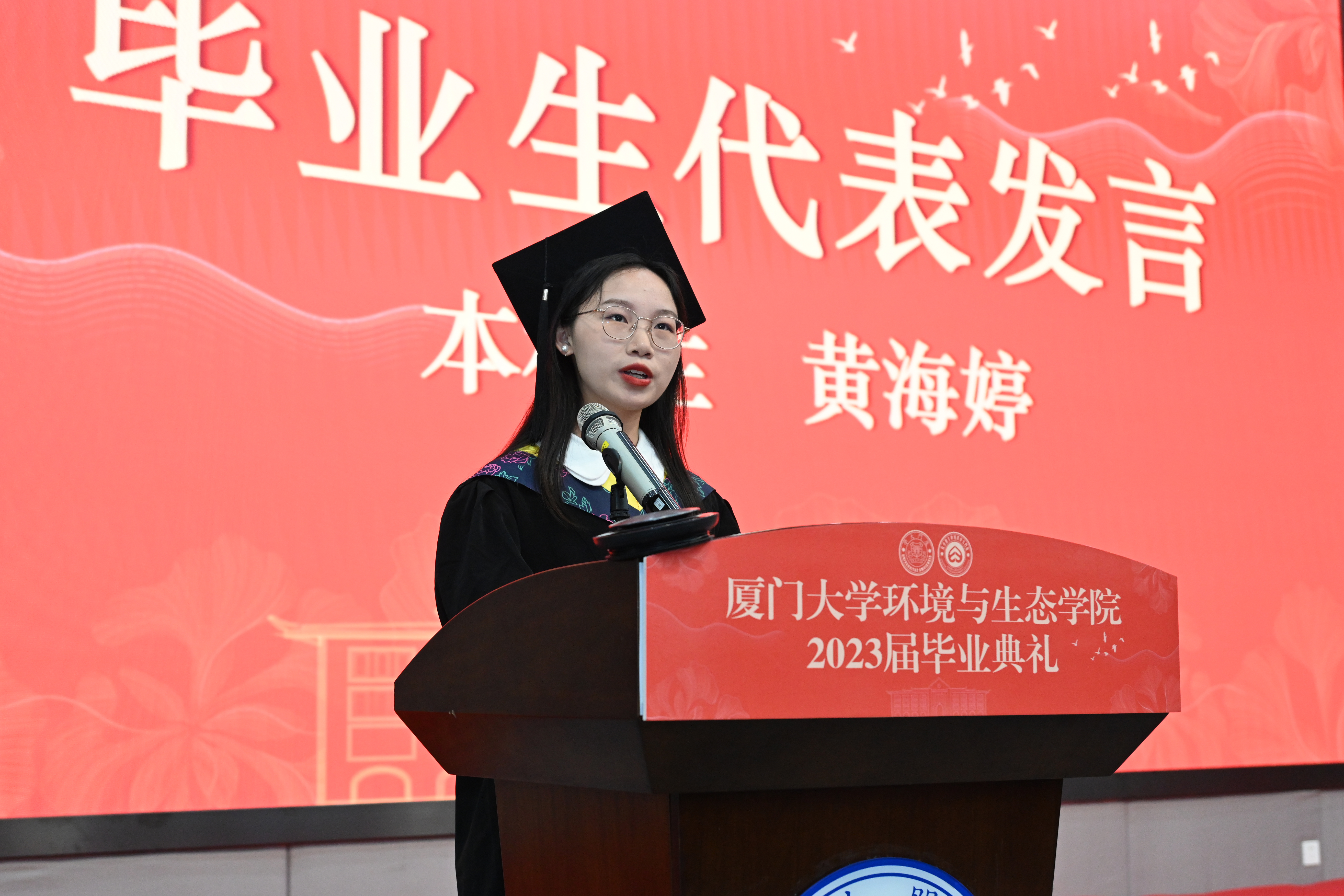 2023届本科毕业生代表黄海婷、研究生代表张宇依次上台分享自己的毕业感言。回忆厦园的点滴,他们满怀幸福和感恩。他们深切地感受到,厦门大学不仅仅是一所大学,而是每一位厦大人一生的家园,无论走到哪里,都不能忘了“家”的温暖。同时,他们呼吁全体毕业生要以奋斗姿态激扬青春,不负时代,不负华年。