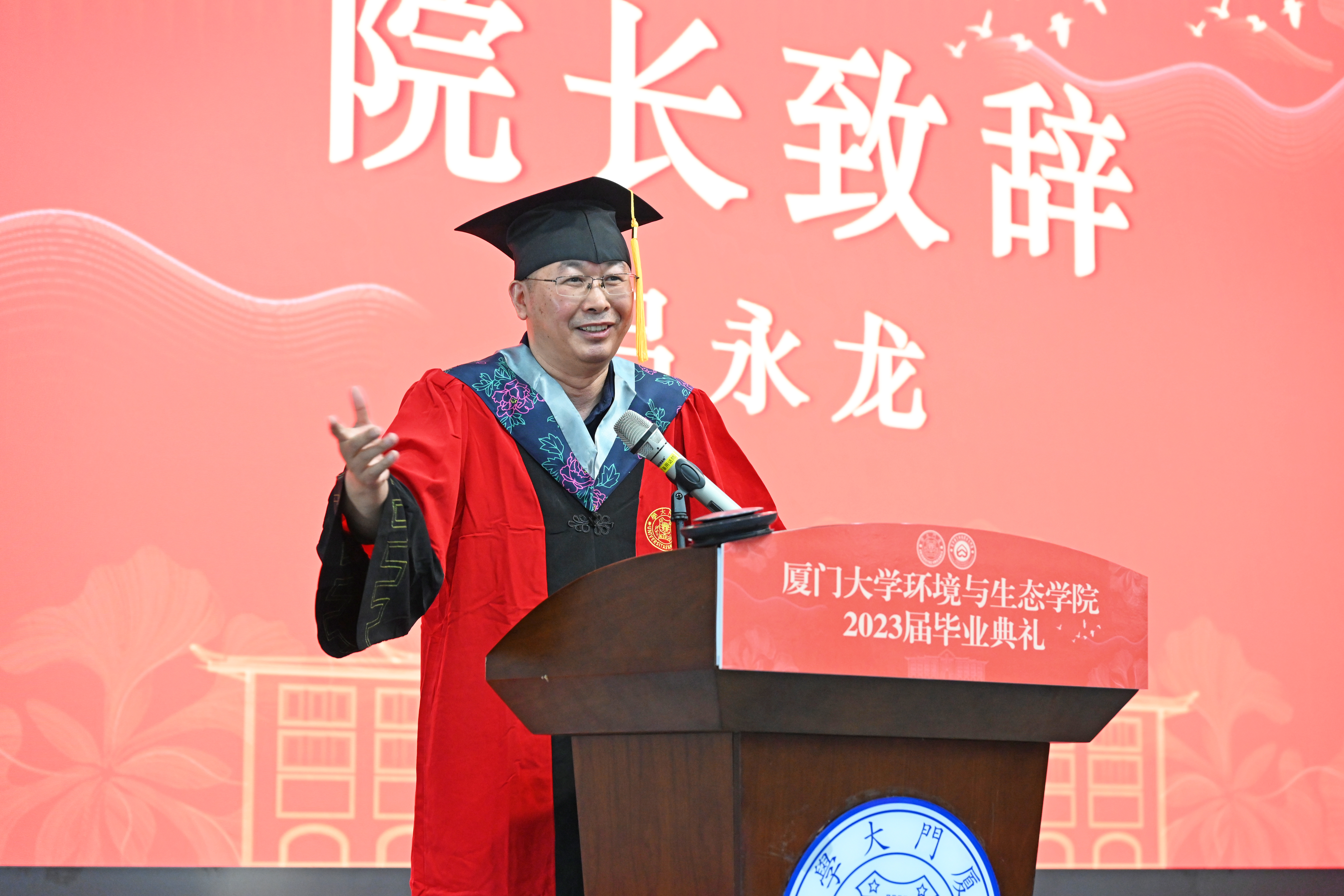 院长吕永龙教授首先上台致辞。他代表学院祝贺2023届全体毕业生在凤凰花盛开的美好时节,顺利完成学业,迎来人生的“丰收季节”。吕永龙说,2023届毕业生和全国人民共同经历了抗疫斗争,每个人都是这场战役取得胜利的参与者、见证者和贡献者。他用四个词寄语毕业生们:一是独立自强。他希望同学们坚持在抗疫斗争中磨练出的独立自主和坚强意志,在砥砺奋进中接受洗礼,在风险挑战面前勇毅前行。二是坚毅坚守。疫情期间,同学们通过不懈奋斗,披荆斩棘,突破了重重险阻,用坚毅的心坚守求学路、奔赴每一场山海。希望同学们未来继续迎难而上,在人生的赛道上奋力奔跑、勇往无前。三是规矩秩序。“不以规矩,不成方圆”,文明的进步从来离不开规则的匡正,社会的公序良俗和国家的长治久安,无不系于每个人对秩序与规则的慎思笃行。他叮嘱同学们敬畏规则,自律而行之。四是和谐共生,他教导毕业生们要深怀对自然的敬畏之心,尊重自然、顺应自然、保护自然,积极投身人与自然和谐共生的伟大实践,为推进生态文明建设贡献智慧与力量。最后,他祝愿毕业生们前程似锦、一帆风顺。