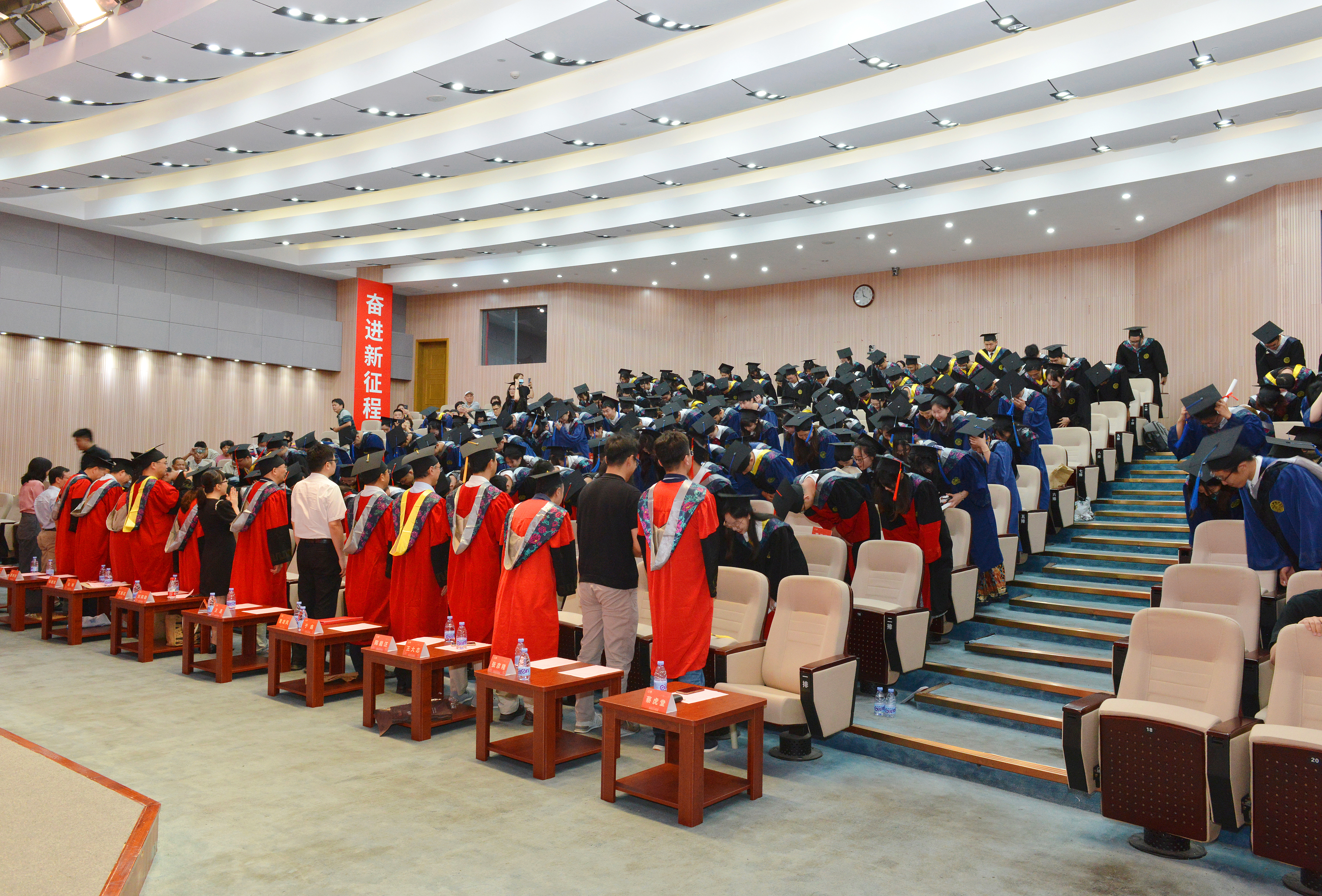 在感恩致谢环节中,毕业生通过三次深深的鞠躬,表达了对老师、行政后勤等工作人员以及父母亲友的敬重与感激。