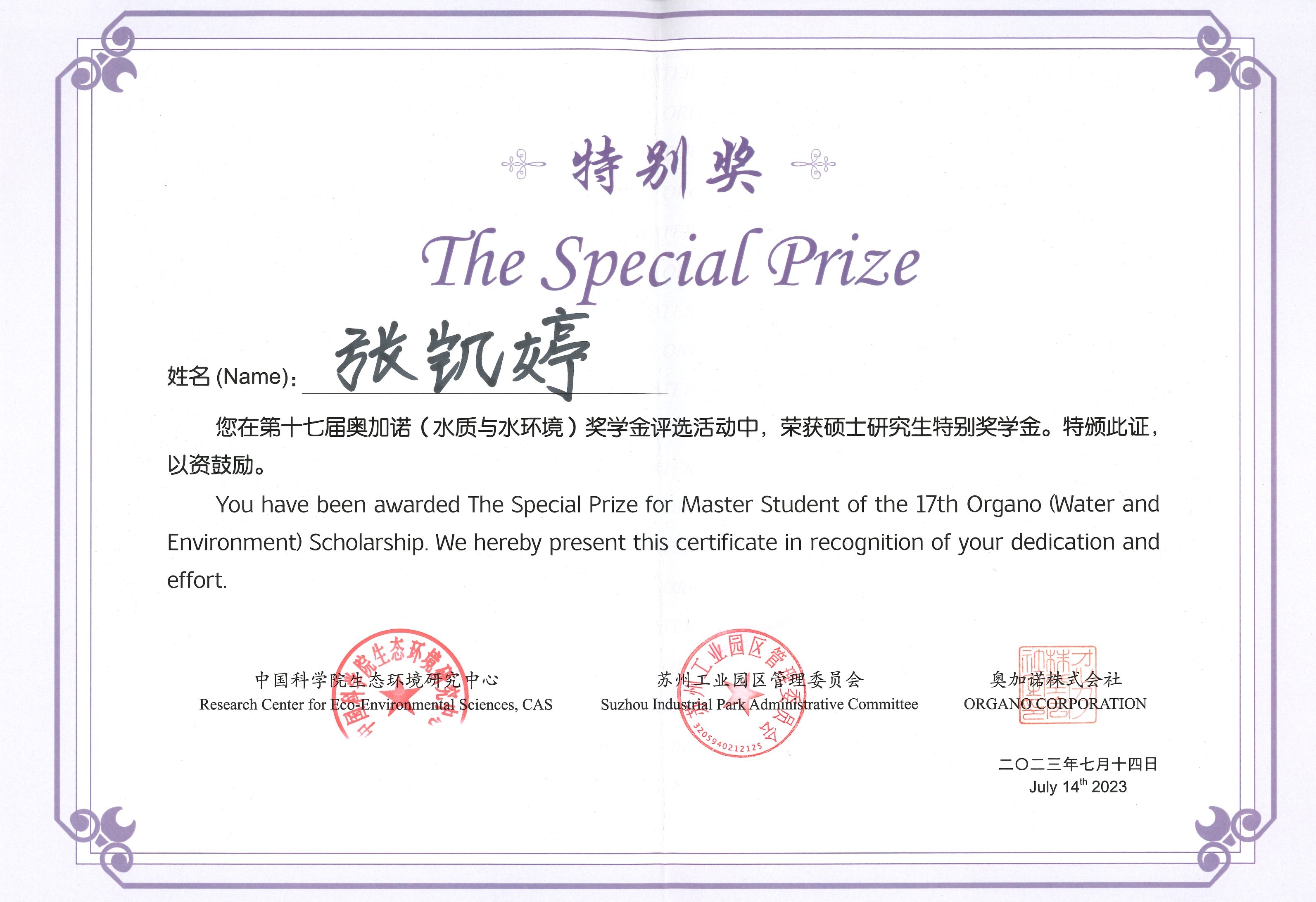 “奥加诺(水质与水环境)奖学金”是由中国科学院生态环境研究中心与苏州工业园区管理委员会主办、日本奥加诺株式会社(ORGANO CORP.)和奥加诺(苏州)水处理有限公司赞助的一项奖励,该奖学金面向全国,设立宗旨是奖励在“水质与水环境”领域从事科学技术研究与应用并取得突出成绩的研究生,推动国内水环境保护和水处理事业的发展。现已成为国内水环境领域奖学金的一个知名品牌。其中,择优选择12名研究生参加最终评审会,硕士研究生特别奖为表彰初评过程参评硕士研究生中评委综合打分最高、研究成果创新性较强或技术应用意义较高的硕士研究生。