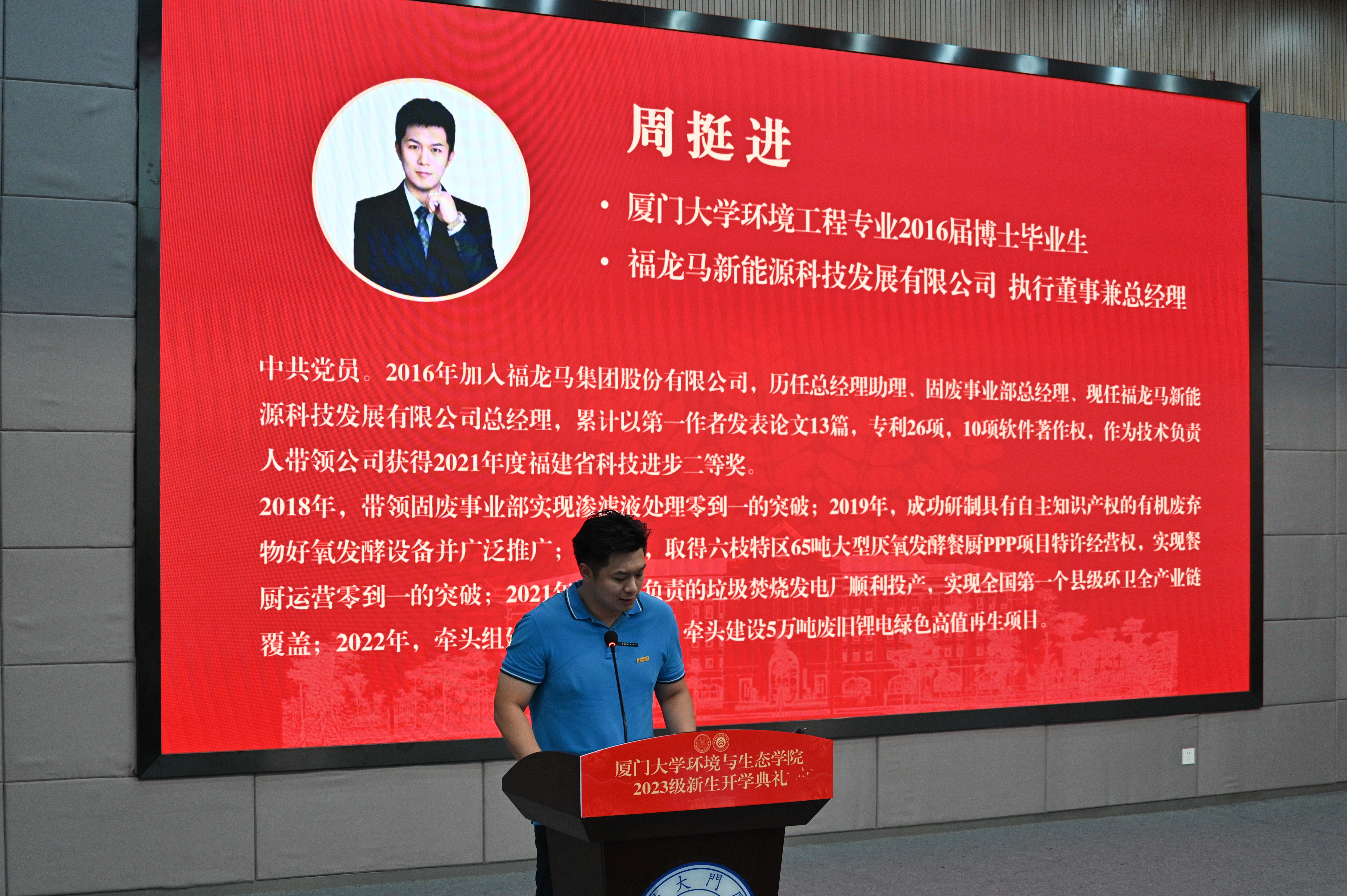 2013级院友、福龙马新能源科技发展有限公司执行董事兼总经理周挺进向学弟学妹们送上真挚的寄语和祝福。他回顾了自己在校期间的学习和生活,表达了对学院和老师的感恩之情。随后,他结合自身工作经历和感悟,寄语同学们持续提升认知,不给人生设限;坚持认识自我,找到真正热爱;做难而正确的事,让路越走越宽;以厦大校训不断激励自己,努力成为具有中国情怀、国际视野的复合型人才。