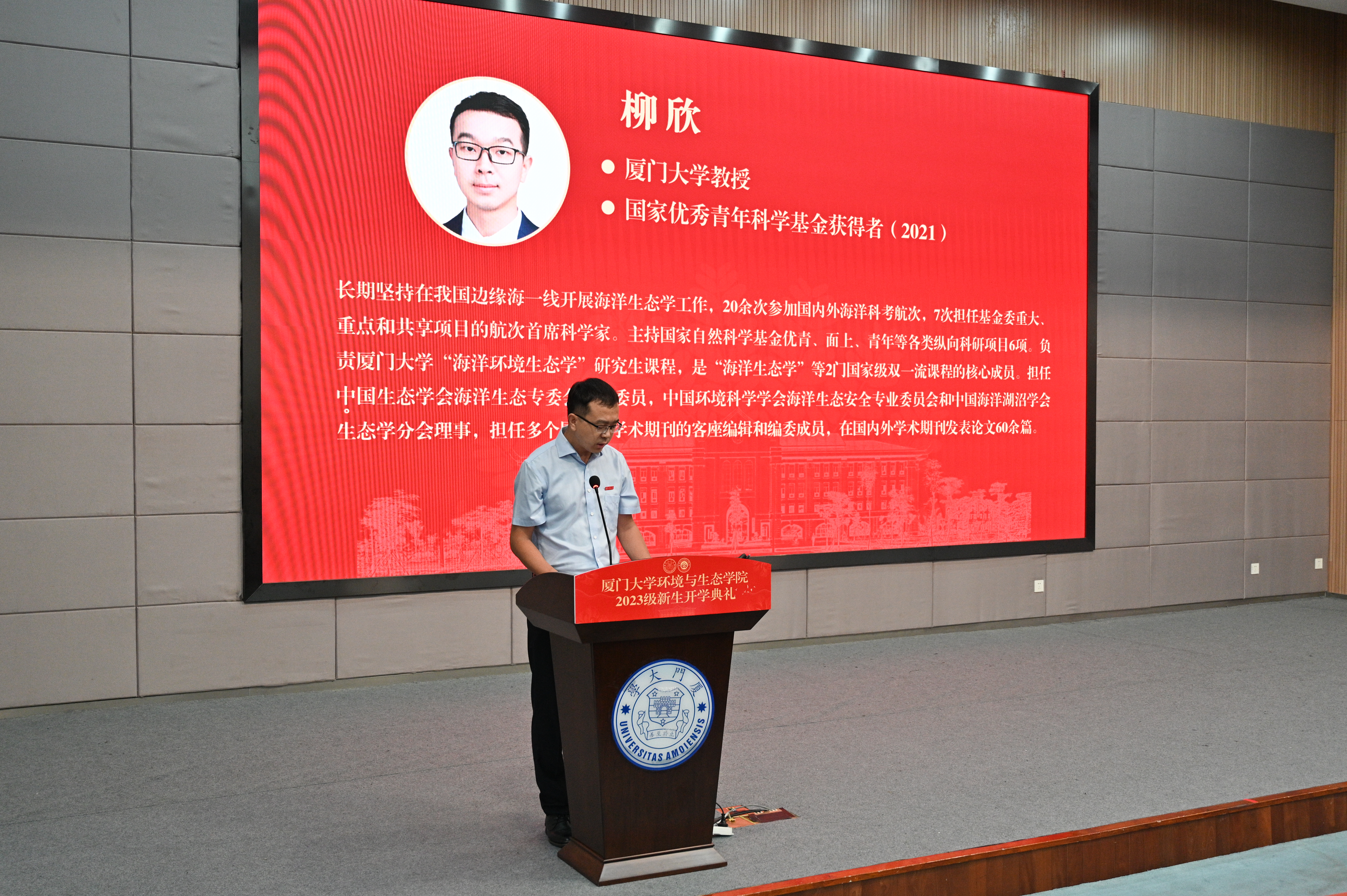 柳欣教授作为教师代表发言。他声情并茂地给新生们讲述自己对海洋生物生态学从因兴趣入门到深深热爱的历程,以及环生人肩负的沉甸甸的使命担当。他勉励同学们传承和弘扬厦门大学“四种精神”,拿出舍我其谁、勇往直前的决心,看清全局、顺应大势、勇立潮头;以强烈的好奇心、久久为功的毅力和无畏的批判精神,主动学习和接受知识,提高核心竞争力,练好内功占据生态位;他还希望同学们在学会爱的同时,也学会接受爱、传递爱、表达爱,勇敢奔赴前方的星辰大海,坚定守护我们的地球家园,在新征程中成就更完美更精彩的自己。