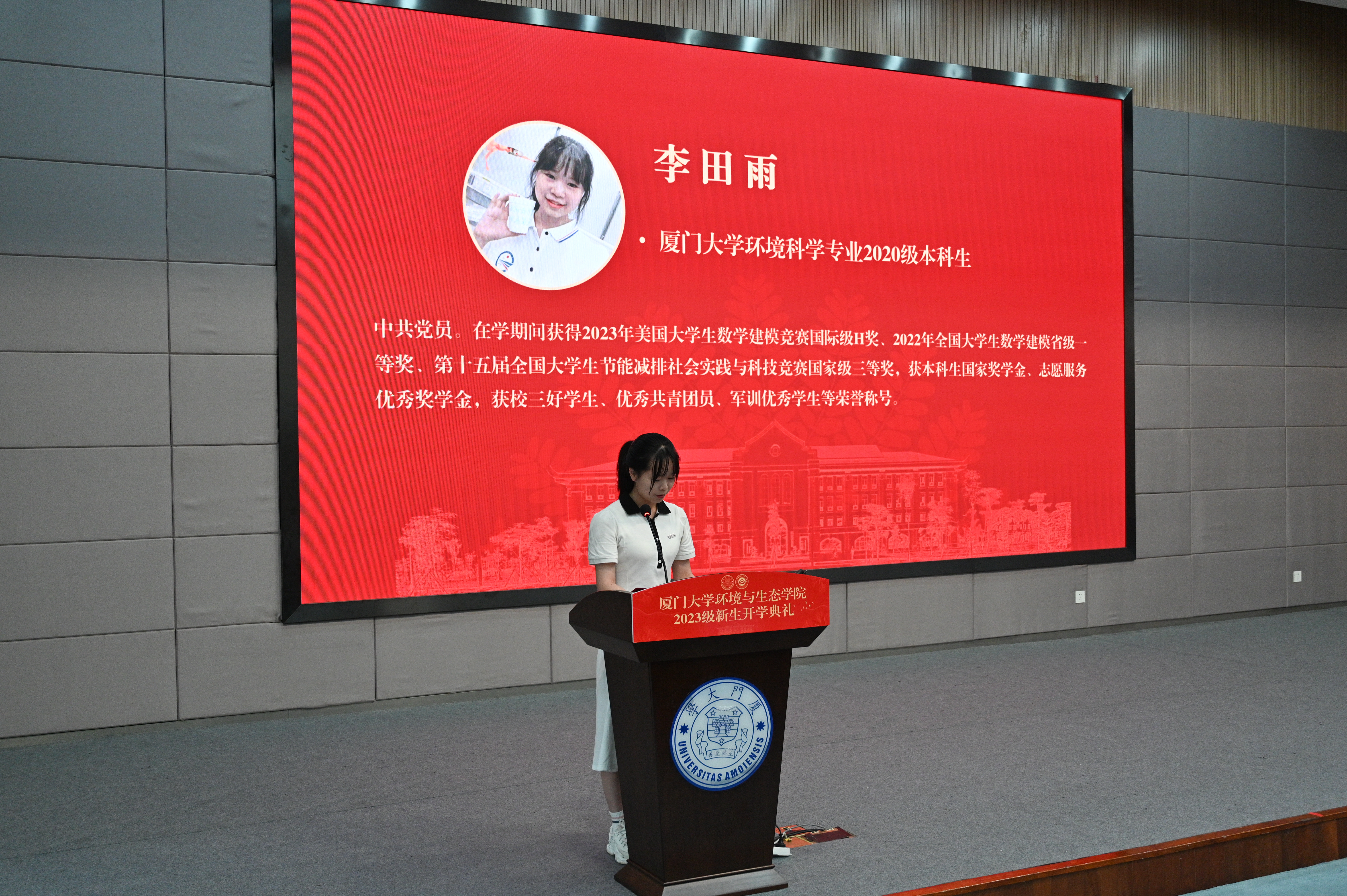 老生代表、2020级本科生李田雨分享了自己校园学习生活的收获和体会。她认为,同学们首先应牢牢把握“主动适应”这个大学生活的核心,敢于攀登学术高峰,实现自我成长和全面发展;其次,要敢于跳出舒适区,深入挖掘自己的兴趣爱好,多尝试新鲜事物;最后,要积极履行社会责任,带领更多的人投入到环境保护与生态文明建设中,从而不断提高民众热爱、保护、改善环境之实效。