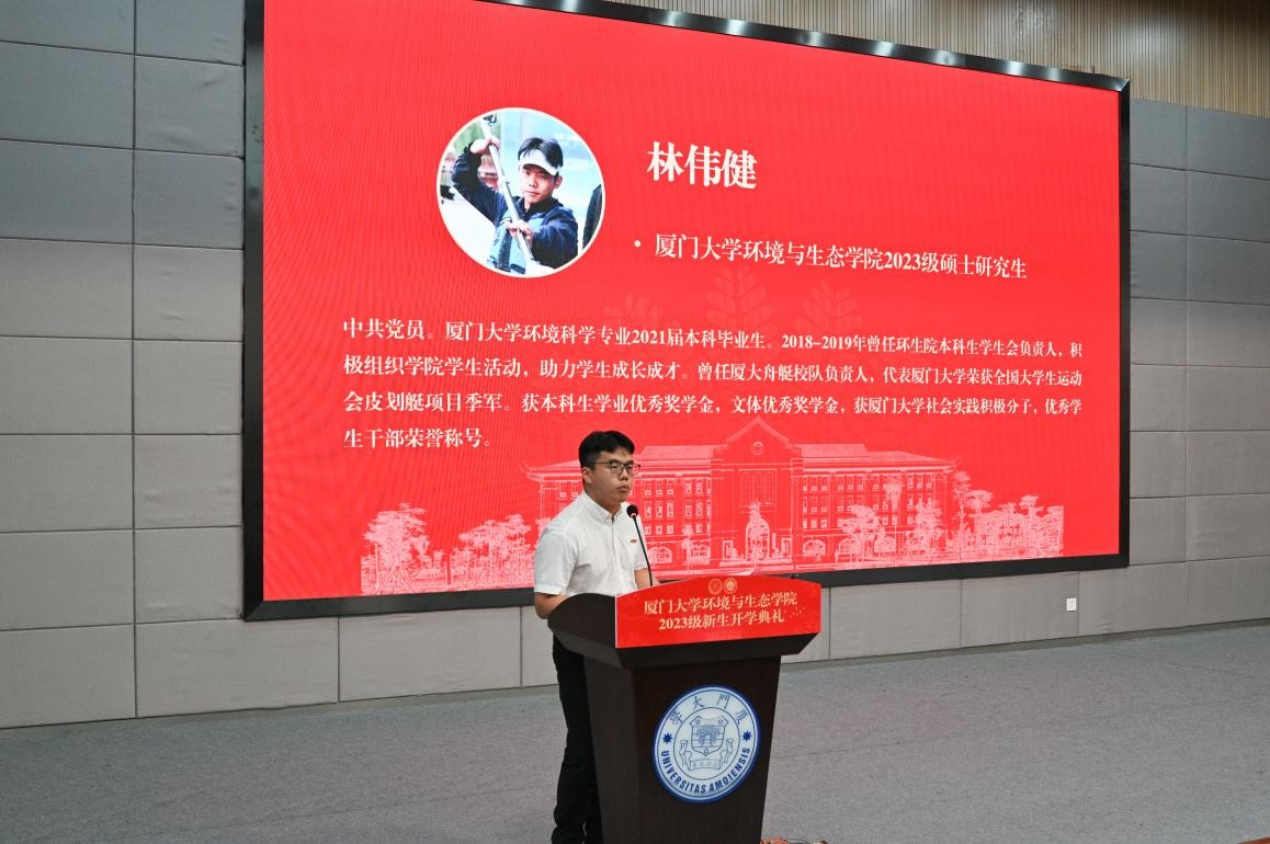 新生代表、2023级硕士研究生林伟健作为新生代表发言。他从责任和使命出发,希望同学们能够拓展视野,树立世界眼光,知行合一,用双脚丈量祖国大地,将所学用于实践,将个人价值融入国家和民族的命运。