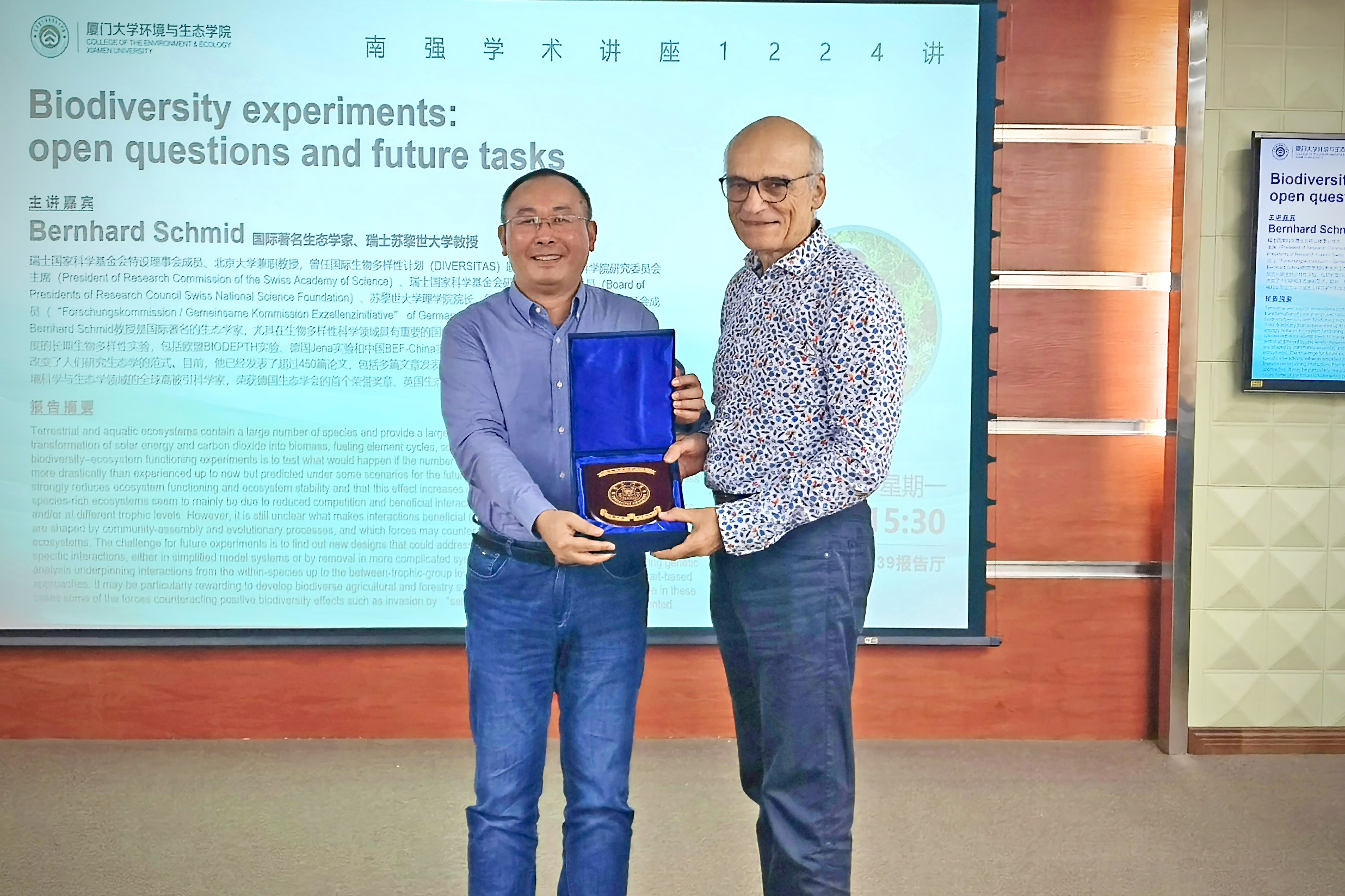 11月13日下午,国际著名生态学家、瑞士苏黎世大学教授、瑞士国家科学基金会特设理事会成员、北京大学兼职教授Bernhard Schmid做客厦门大学“南强学术讲座”,在学院A239报告厅为师生带来题为“Biodiversity experiments: open questions and future tasks”的专题讲座。讲座由学院陈宇新副教授主持。