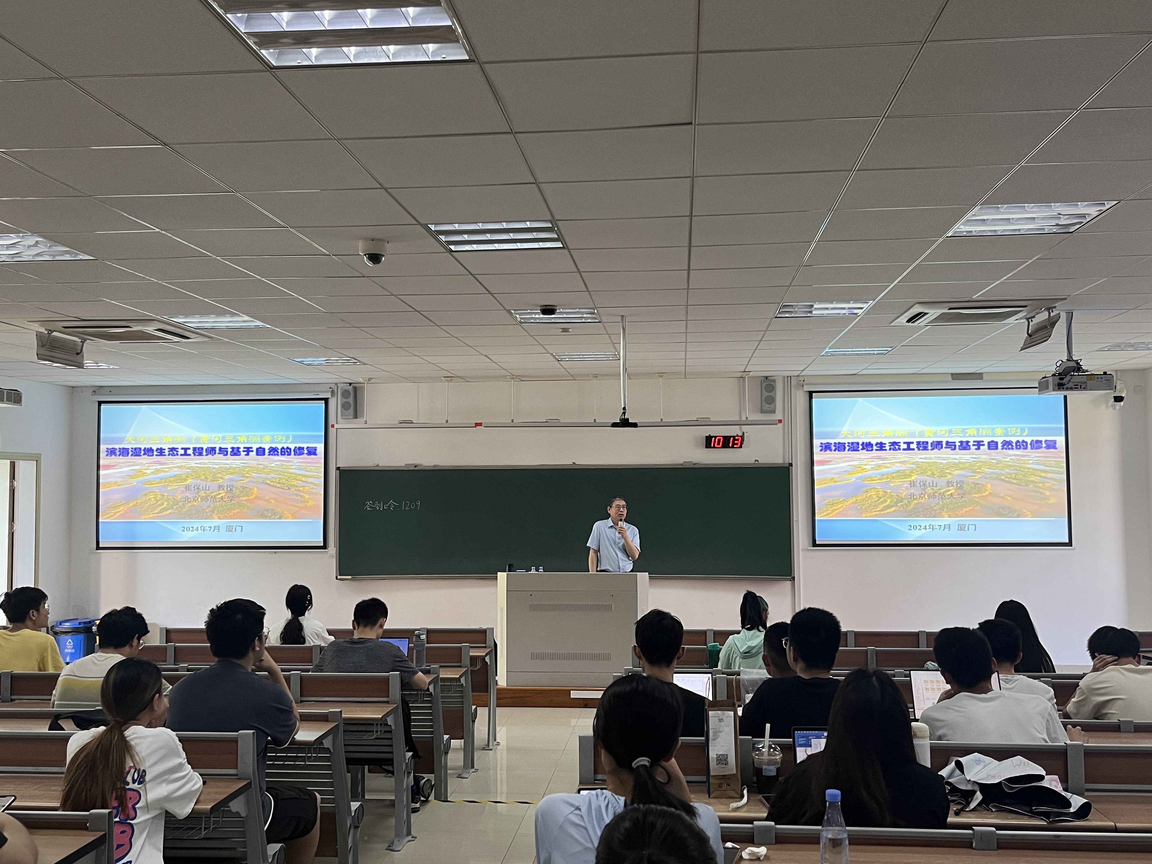第八场讲座是由北京师范大学崔保山教授主讲。崔保山介绍的主题为大河三角洲滨海湿地生态工程师与基于自然的修复。他从大河三角洲滨海湿地面临的问题与修复现状和黄河三角洲湿地典型生态工程师及修复启示两方面展开,引起同学们对于滨海湿地生态修复的兴趣。