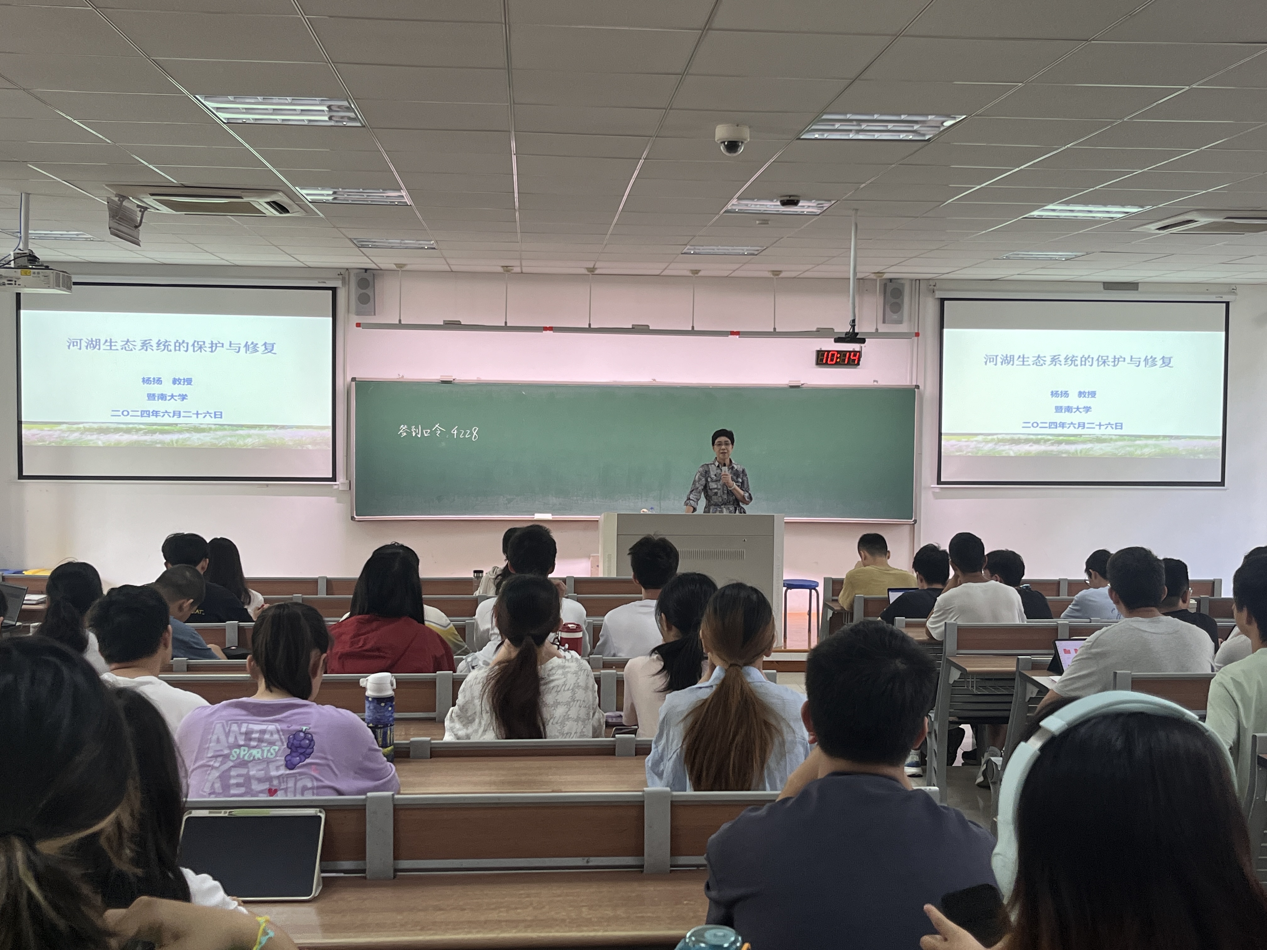 第二场讲座由暨南大学杨扬教授主讲。杨扬介绍的主题是河流生态系统的保护与修复。她详细介绍了改善水体交换、底泥生态疏浚、沉水植被恢复、植物缓冲带建设在内的多种生态修复受损水体的方法。此外,还介绍了生物操纵防治水体富营养化的技术,分享各个技术在实际案例中的应用,为同学们提供了很好的学习案例。