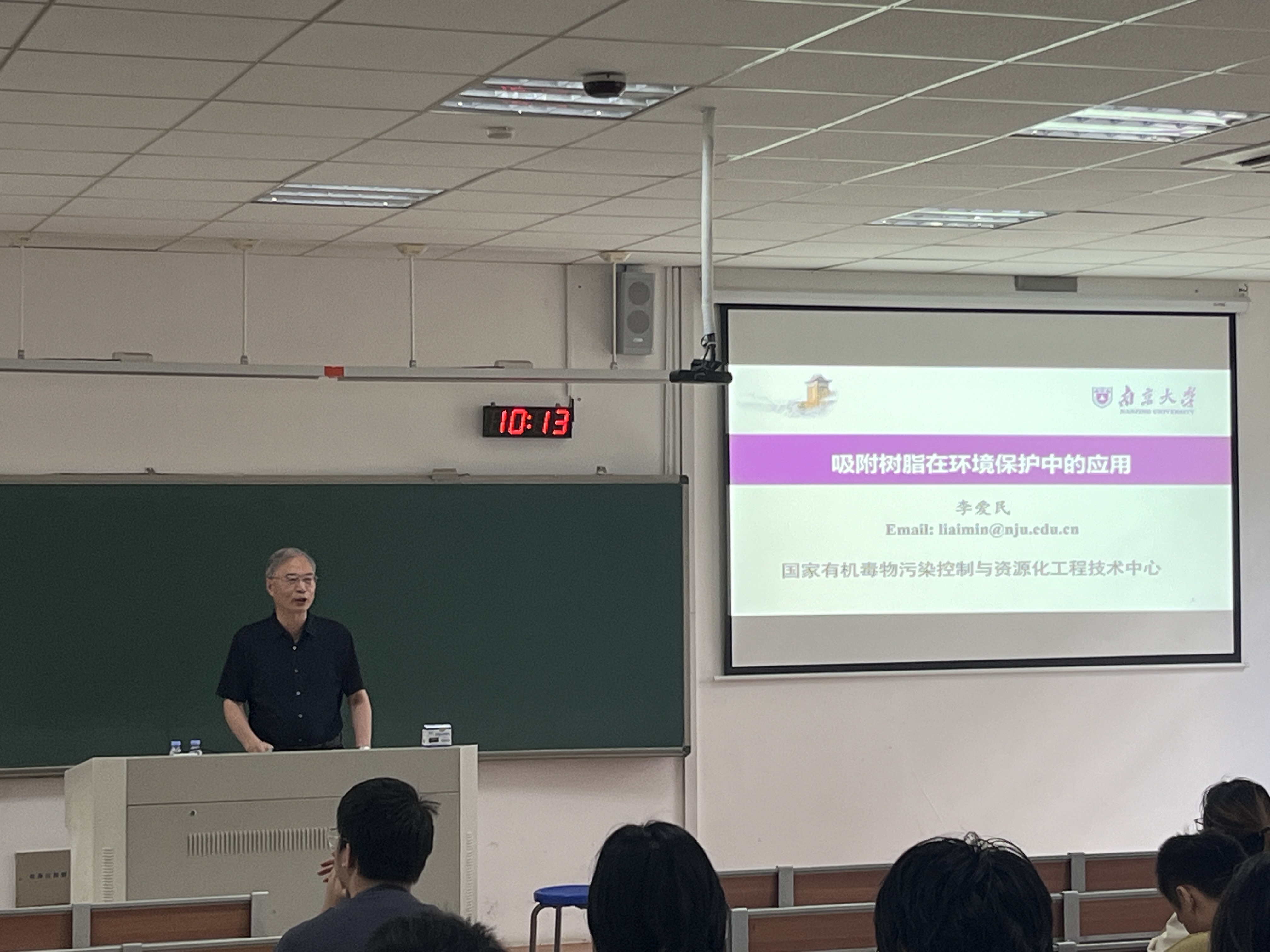 第九场讲座是由南京大学李爱民教授主讲。李爱民介绍的主题是吸附树脂在环境保护中的应用。从树脂处理技术的发展历程出发,引出了树脂法处理工业有机污染物及其资源化、树脂法净化水源水中有机质及其资源化和树脂法处理非常规水及其资源化,最后强调了树脂处理技术未来发展探索及思考,为同学们提供了崭新的视角和思路。