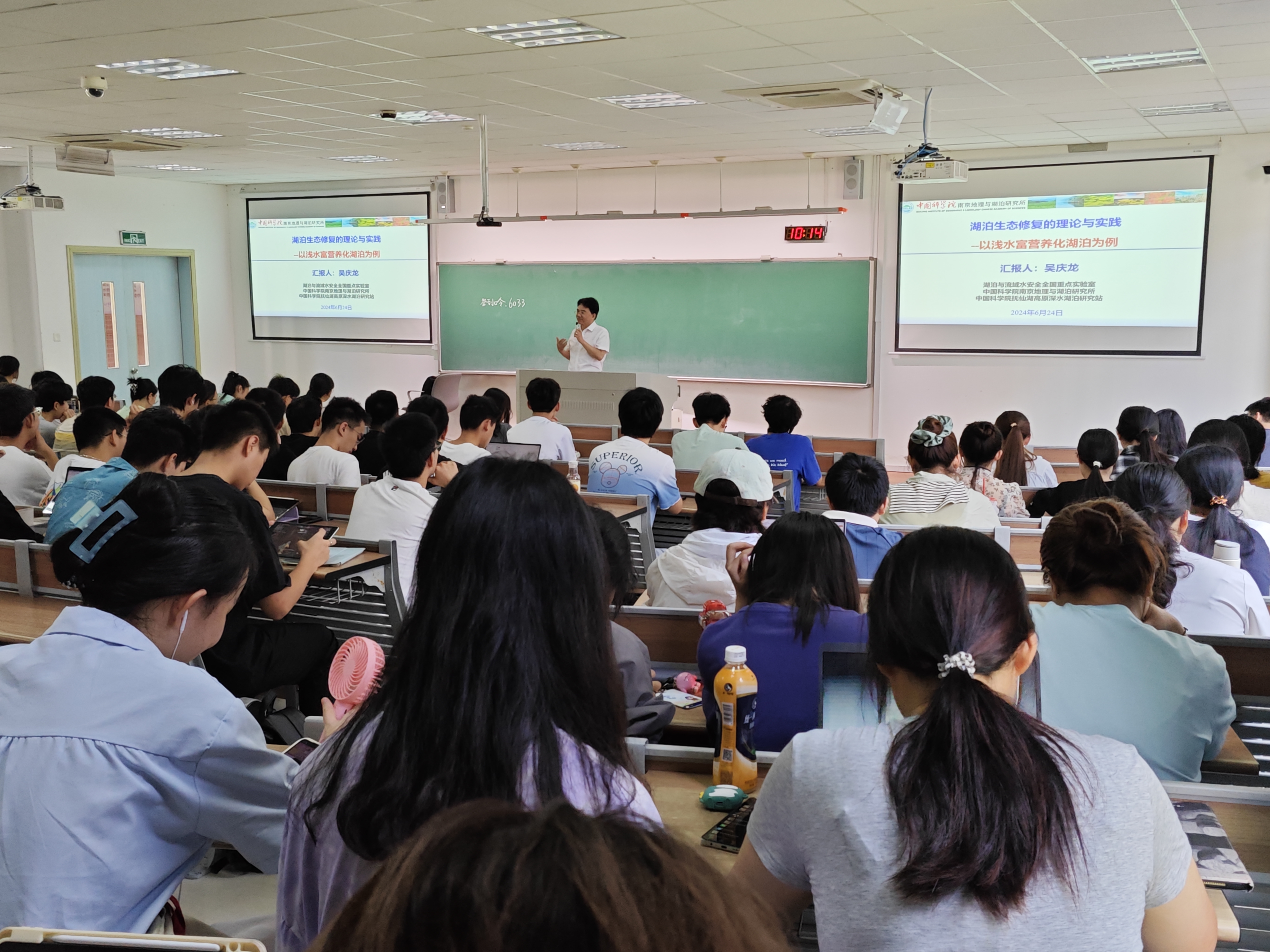 第一场讲座由中国科学院南京地理与湖泊研究所吴庆龙教授主讲。吴庆龙以浅水富营养化湖泊为例,详细阐述了“湖泊蓝藻水华生态灾害形成机理及防治的基础研究”“物理和生物扰动对湖泊沉积物的影响”,引发了同学们对于富营养化湖泊治理和保护的思考。