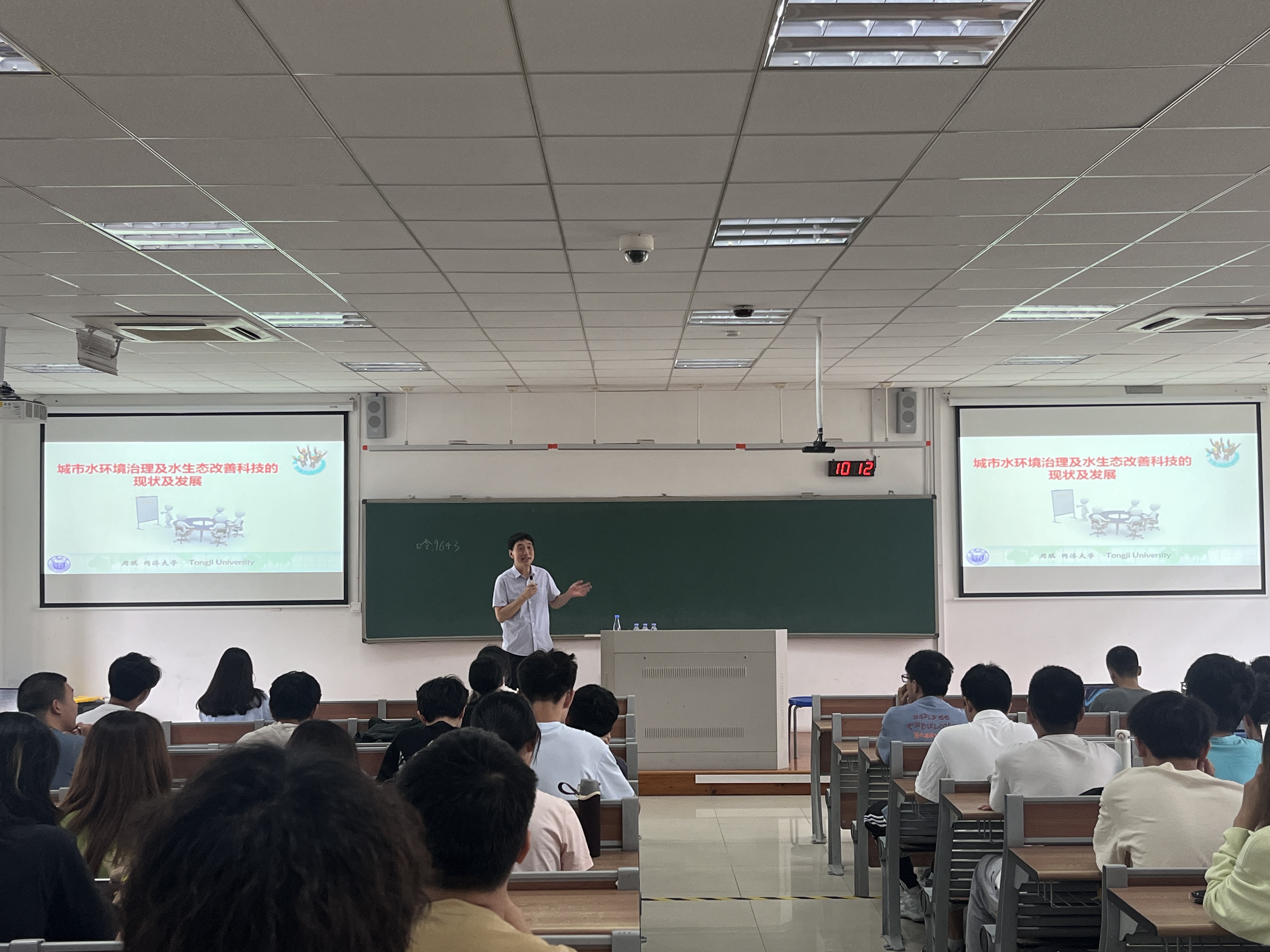 第三场讲座是由同济大学周琪教授主讲。周琪介绍的主题是城市水环境治理及水生态改善科技的现状及发展。他为大家介绍了大型污水厂污水、污泥、臭气高效处理工程关键技术,以及如何建设环境友好型污水厂。通过城市污水处理与资源化技术研究及工程示范的例子引起同学们对环境工程及污水处理厂的兴趣和思考。