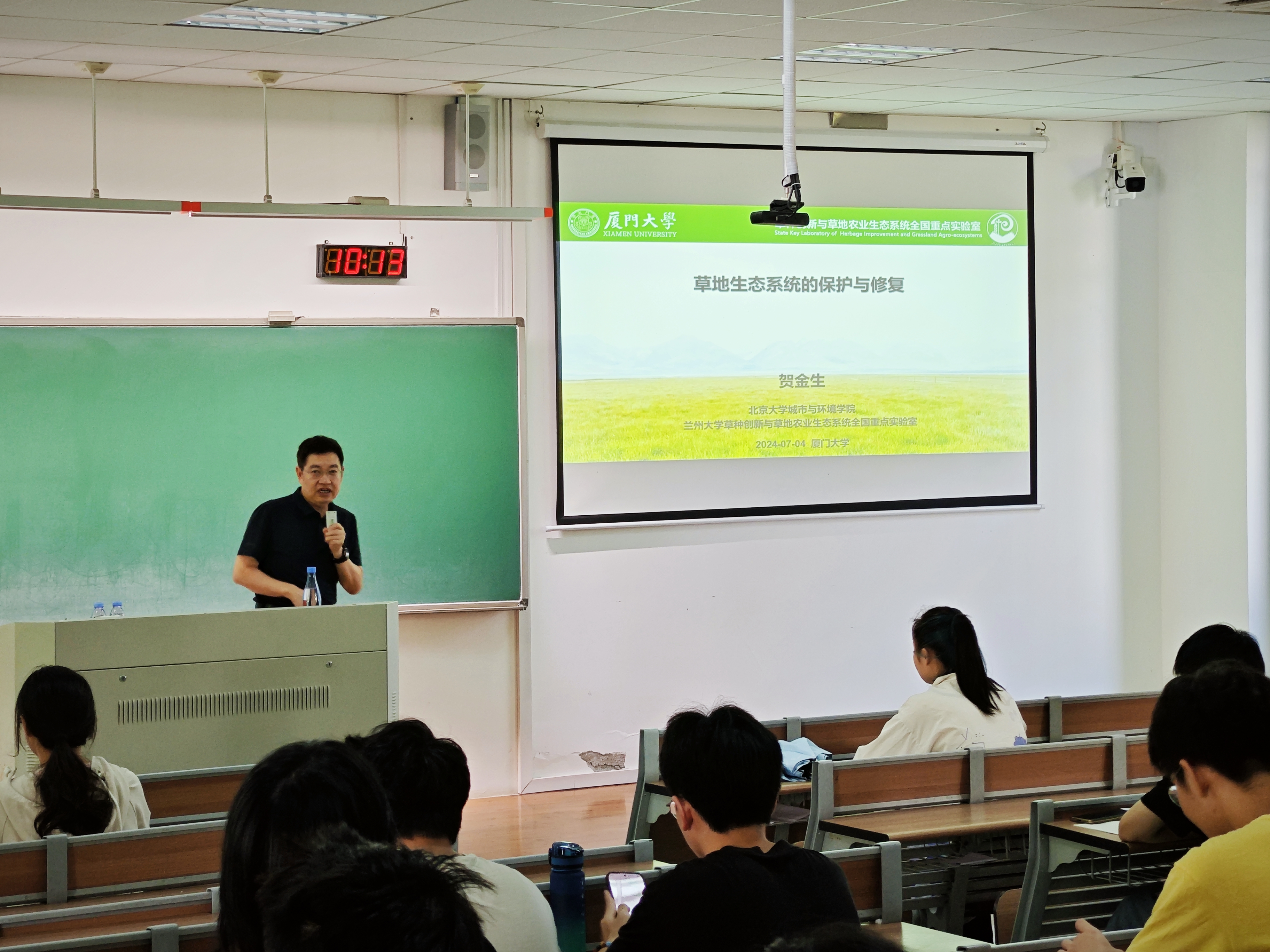 第五场讲座是由北京大学、兰州大学贺金生教授主讲。贺金生介绍的主题为草地生态系统的保护与修复。他从草地的分布与人类的关系、草地生态系统的结构和功能、气候变化对草地生态系统的影响、人类活动对草地生态系统的影响以及草地生态系统的保护与修复五个方面进行介绍,使同学们对于草原生态系统的研究有更清晰的认知。
