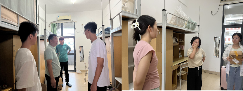 当天傍晚,学院党委副书记蔡虎堂带领新生班主任赵阳莹和辅导员肖莉君依次走访新生宿舍,与新生面对面交流,及时了解新生入住情况,当场解决学生一些困难,勉励新生以良好的状态迎接美好的大学生活。
