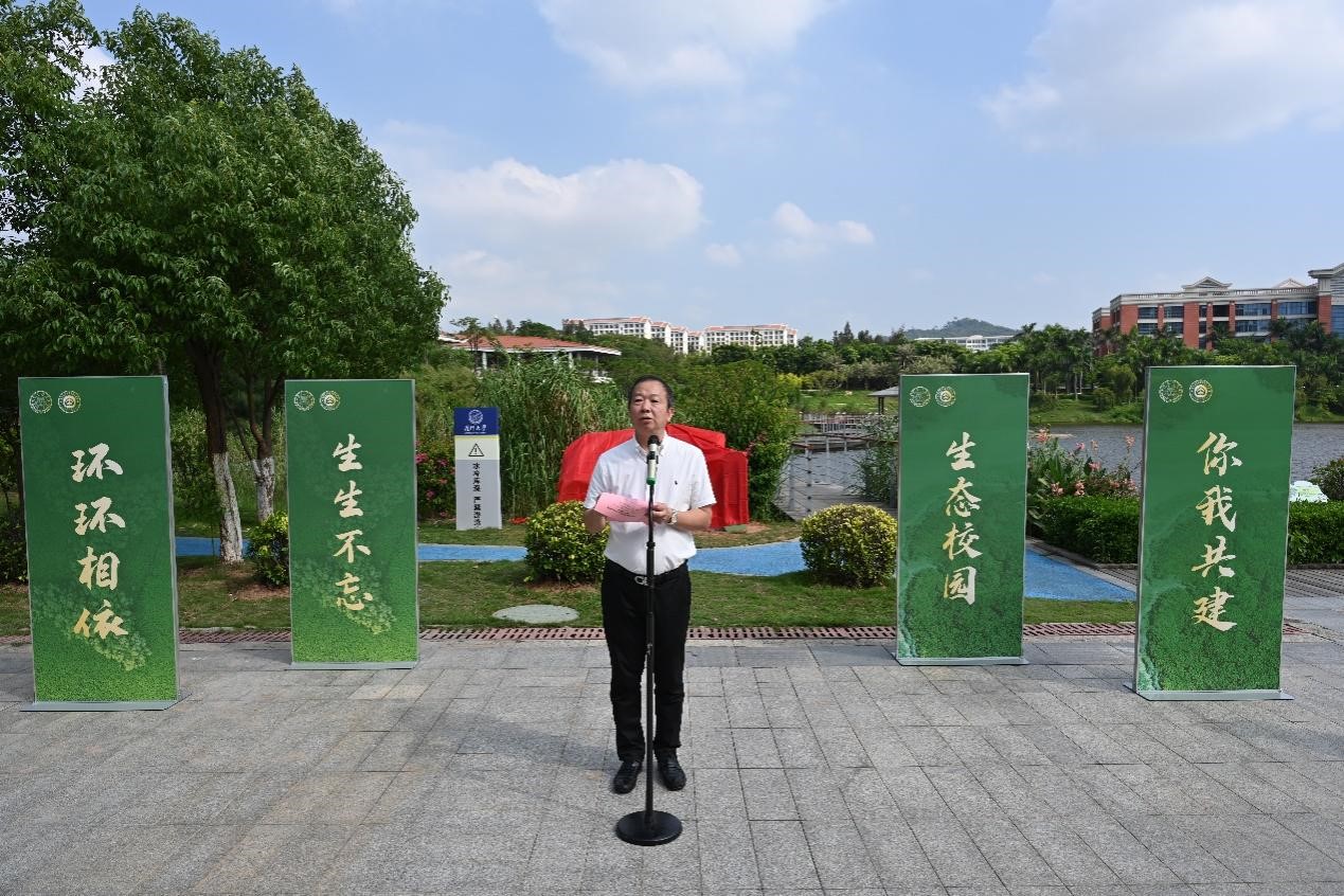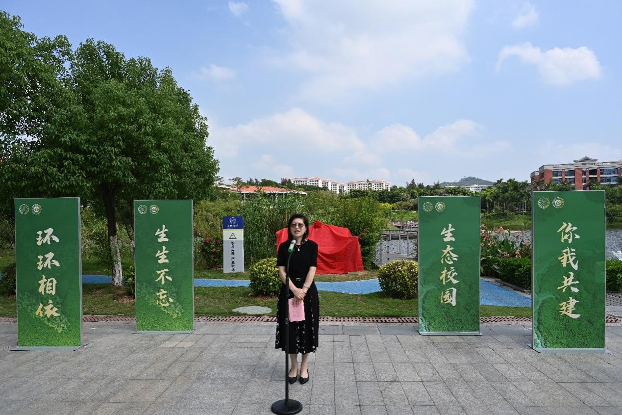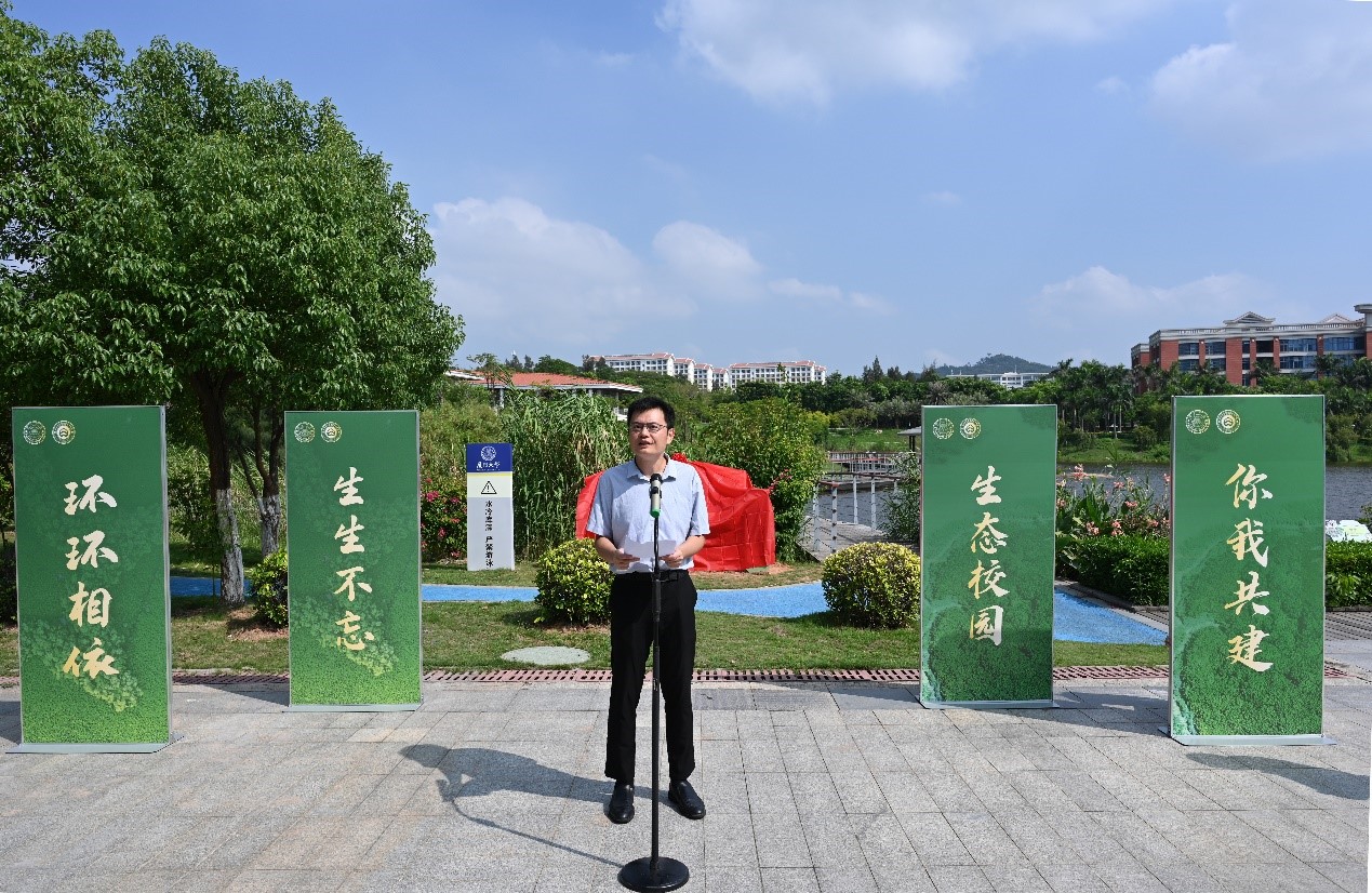 陈光在致辞中充分肯定了环芙蓉湖生态科普项目对于推动生态校园建设的意义,向为科普项目的建设付出辛勤努力的环境与生态学院师生以及中国农业银行厦门市分行的捐赠支持表示感谢。他表示,环芙蓉湖生态科普项目的揭牌,标志着校区生态环境宣传教育工作有了新的平台,校区在贯彻新发展理念、推动生态校园建设方面又迈出了坚实的一步。展牌体现出来的年轻化、特色化的“科学味道”,受到青少年学生的欢迎和好评。生态科普项目是围绕立德树人根本任务,把生态文明教育融入“三全育人”体系,探索党建和生态校园建设融合的成功案例。希望环境与生态学院继续发挥专业优势,扩大生态科普的辐射区域和物种种类,构建校区生物物种数据库,不断探索和创新生态科普教育模式,打造校园生态文化科普基地,高质量助力校区生态校园建设,讲好校区生态文明故事。