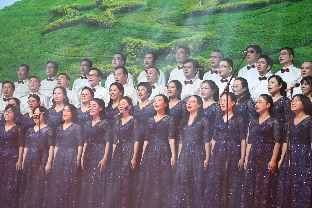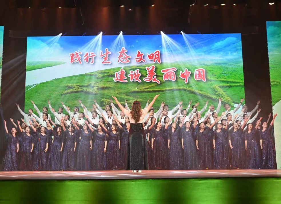 展演现场,学院教职工身着华美统一的服饰,精神抖擞登上舞台,以激昂歌声唱响《国家》,抒发对祖国的无限热爱与对生态文明建设的坚定信念。女声清脆悦耳,如灵动的清泉,流淌着对祖国繁荣富强的歌颂;男声沉稳有力,似雄浑的波涛,展现出建设美丽中国的担当。嘹亮的歌声,唤起中华儿女的自豪和向往;优美的旋律,奏响中华民族伟大复兴的乐章。