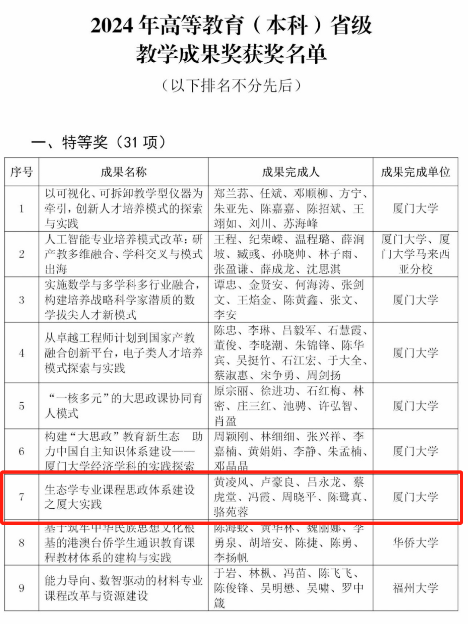 近日,省教育厅公布2024年省级教学成果奖获奖成果,我院黄凌风、卢豪良、吕永龙、蔡虎堂、周晓平、陈鹭真、骆苑蓉以及马克思主义学院冯霞共同完成的《生态学专业课程思政体系建设之厦大实践》荣获高等教育(本科)省级教学成果奖特等奖。