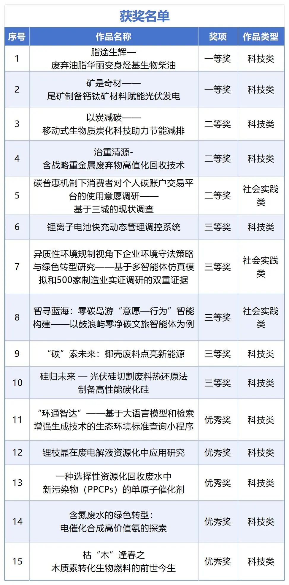环境与生态学院团委书记曹京柱宣读比赛结果。经过专家评审,“脂途生辉—废弃油脂华丽变身烃基生物柴油”和“矿是奇材——尾矿制备钙钛矿材料赋能光伏发电”两个项目斩获一等奖;“以炭减碳——移动式生物质炭化科技助力节能减排”等三个项目获二等奖;“锂离子电池快充动态管理调控系统”等五个项目获三等奖;“‘环通智达’——基于大语言模型和检索增强生成技术的生态环境标准查询小程序”等五个项目获优秀奖。