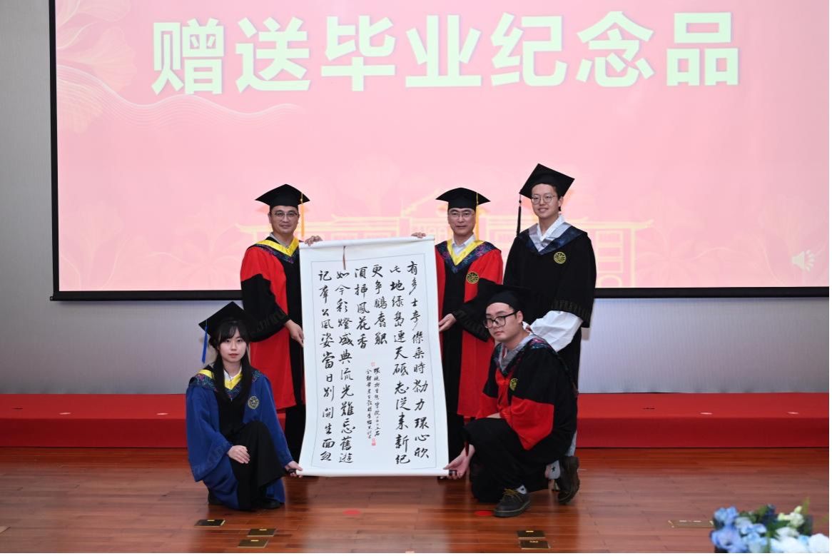 在赠送毕业纪念品环节,2021级本科生李怡昊同学、2022级硕士生陈晨岚同学、2021级博士生林家驹代表全体毕业生,向学院敬献了一份饱含深情的特别礼物——一幅由学生亲手创作的精美书法作品。学院副院长于鑫教授、马剑教授代表学院上台接受赠礼。这幅作品,不仅承载着全体毕业生对学院栽培的拳拳感恩之心,更以艺术的形式镌刻下师生间血脉相连的深厚情谊,成为毕业季里最动人的情感见证。