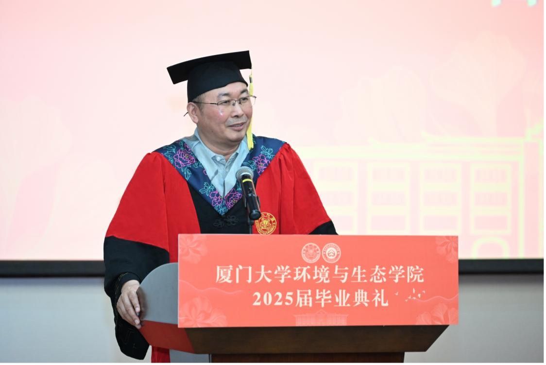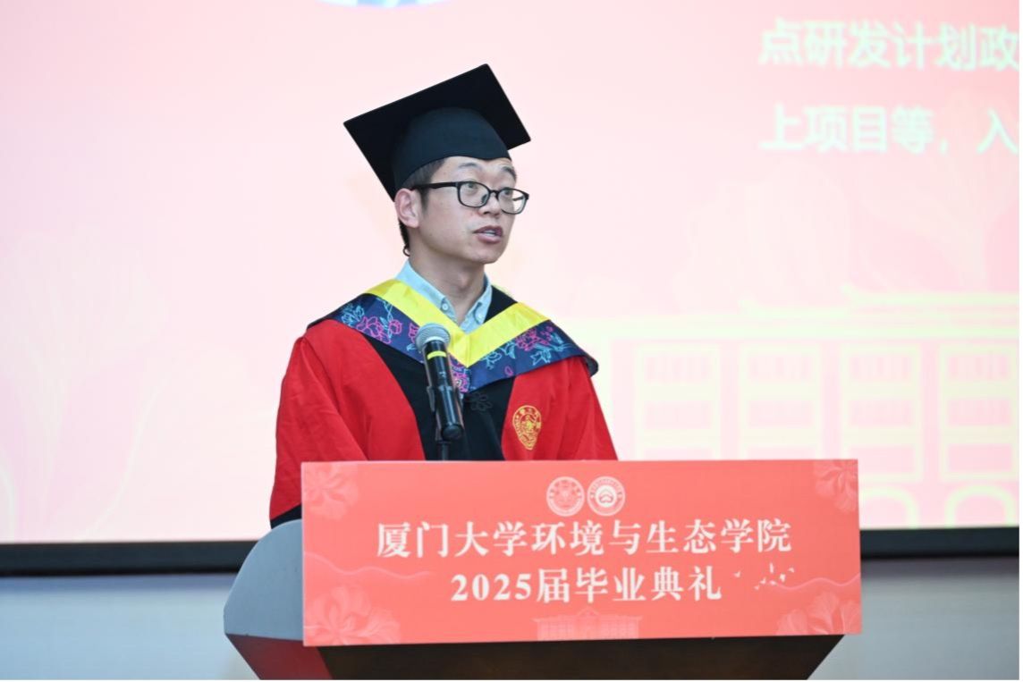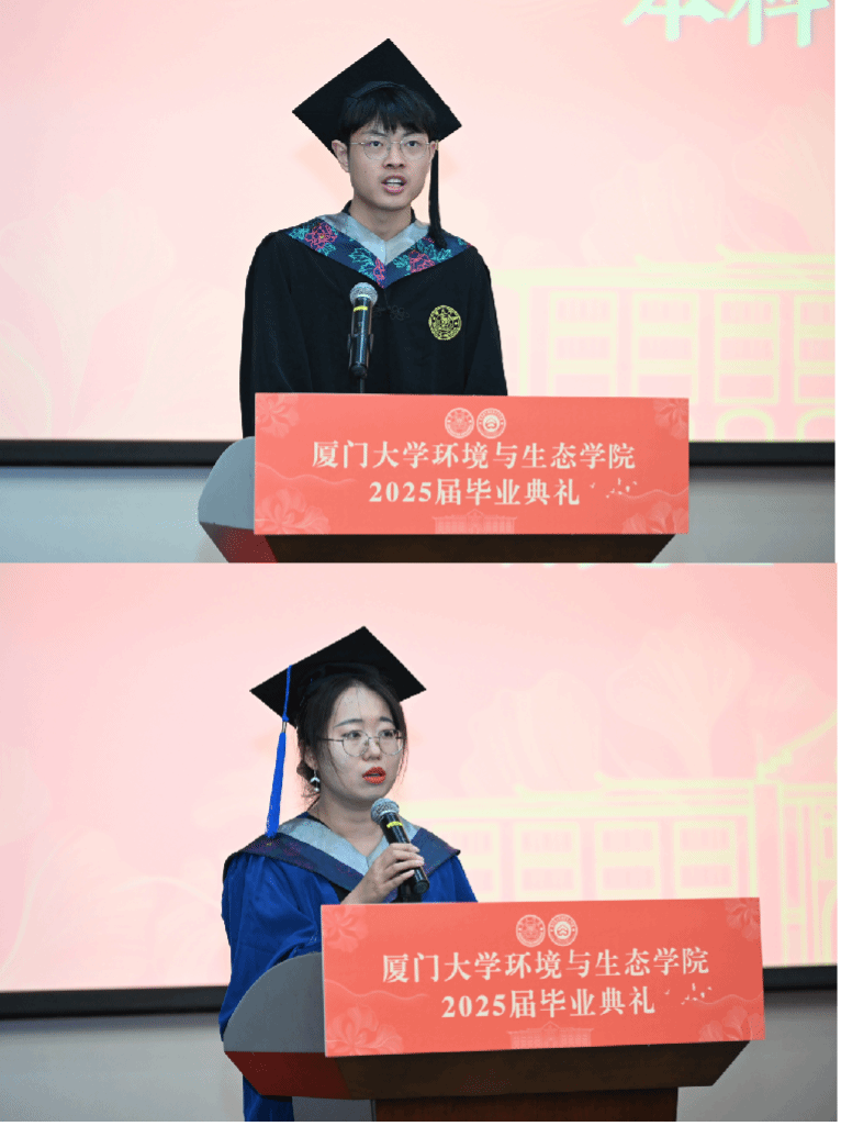 2025届本科生代表张华昊、研究生代表刘继方依次上台分享自己的毕业感言。他们深情回望身处厦园的青春时光,感恩师长的深切关怀和无私付出。他们呼吁全体毕业生将个人理想融入美丽中国建设与全球生态治理,让青春如凤凰花般绚烂,为世界增添生生不息的希望,并祝愿厦门大学薪火相传,育人兴邦,祝愿环境与生态学院精研厚积,栋梁竞出,祝愿辛勤耕耘的老师学术长青,桃李满园,也祝愿每一位即将毕业的同学志展云程,梦绘华章。