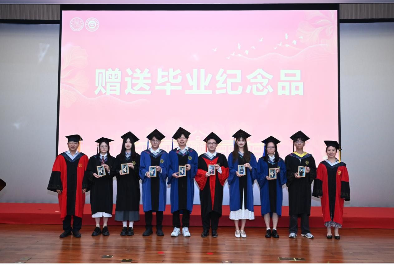 学院副院长王新红教授、黄凌风教授代表学院向毕业生代表回赠纪念品。繁花相送,定格青春。今年,学院为2025届毕业生们拍摄并赠送精美的个人学位照,希望同学们珍藏求学生涯的星光点滴;带着自信与光芒,豪情满怀奔赴星辰大海,书写人生新的华章!