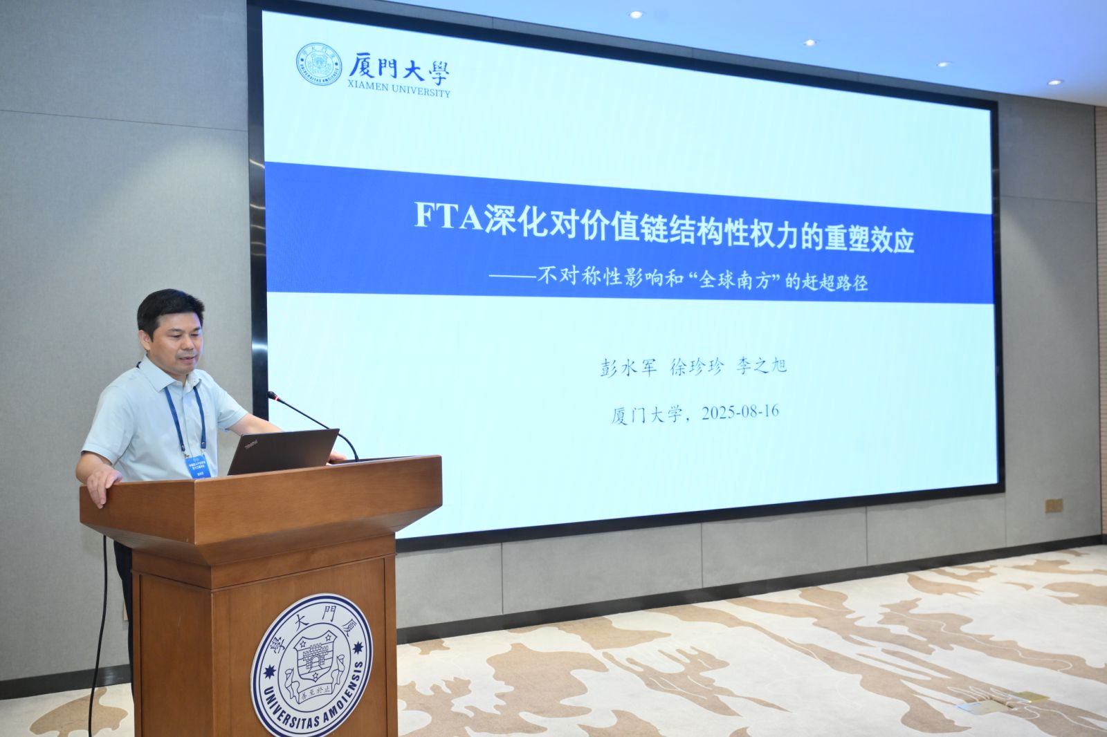 厦门大学经济学院副院长彭水军教授作了题为《FTA深化对价值链结构性权力的重塑效应》的报告。报告指出,自贸协定(FTA)深化通过扩大强国的资源/产业基础控制优势、技术与创新领先优势和市场势力优势,显著提升了强国对弱国的价值链结构性权力,加剧了国家间的价值链结构性权力不对称性。