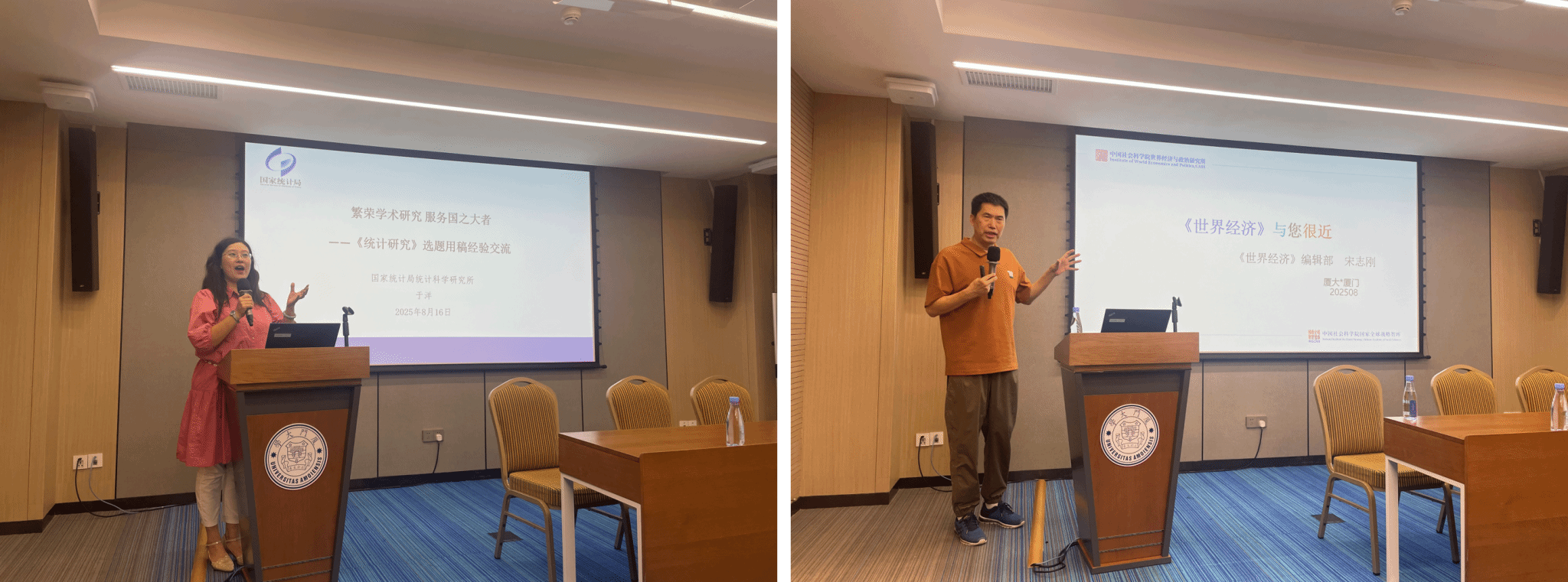 8月16日晚,期刊编辑见面会由中国投入产出学会副理事长、中国人民大学裴建锁教授主持召开。《统计研究》编辑部负责人于洋针对期刊选题和用稿经验进行了交流,详细阐述了期刊的定位及重点选题方向,并表明期刊正在打造一系列学术平台,希望汇聚全国中青年学者,共推统计创新与高质量发展。《世界经济》编辑部副主任宋志刚结合其丰富的审稿经验,深入浅出地分析了学术选题与期刊需求的契合点,强调期刊不设学科和范式门槛,唯以创新与讲好中国故事为录用标尺的办刊理念。